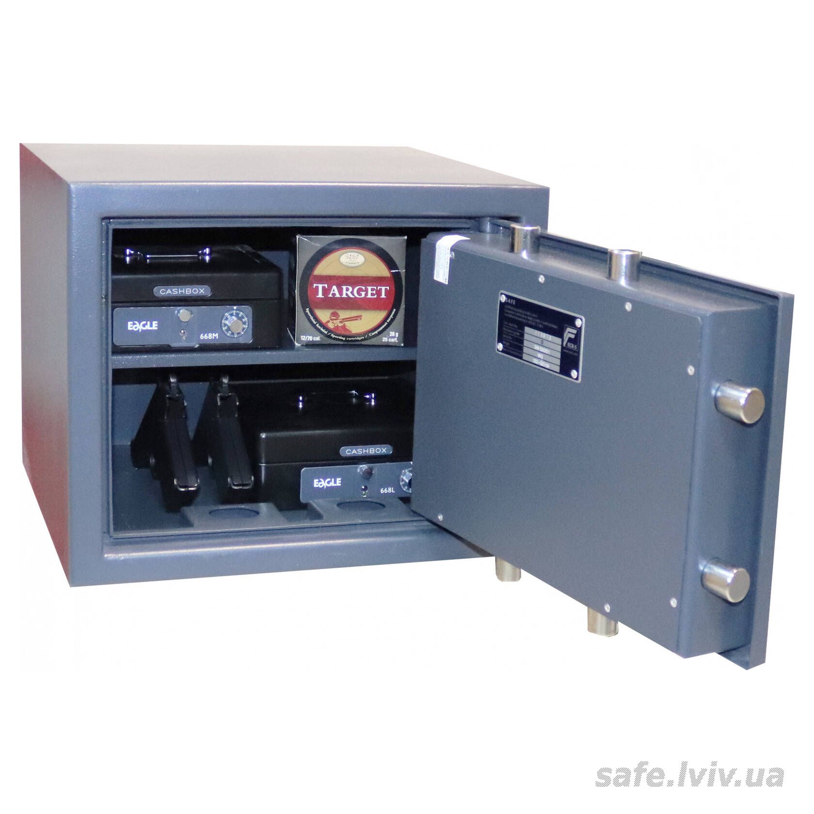 - Сейф вміщає: 2 пістолети, 2 одиниці зброї, документи А4.