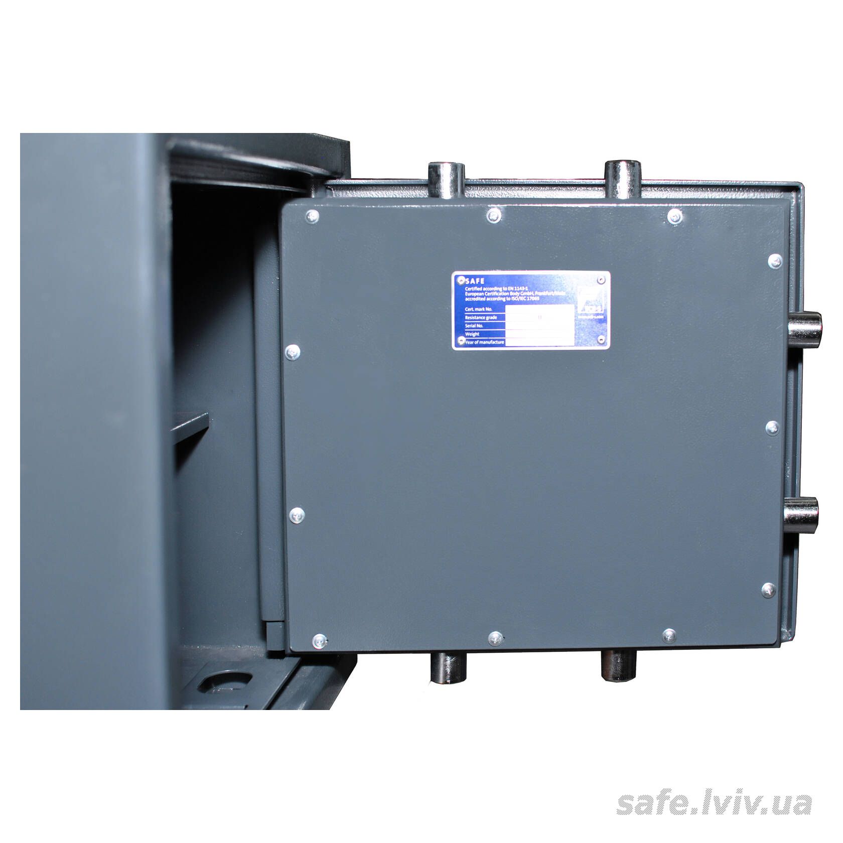 - Конструкція: корпус 20 мм (сталь - зламостійкий бетон - сталь); ригельна система тристороння, 6 ригелів Ø 25 мм.