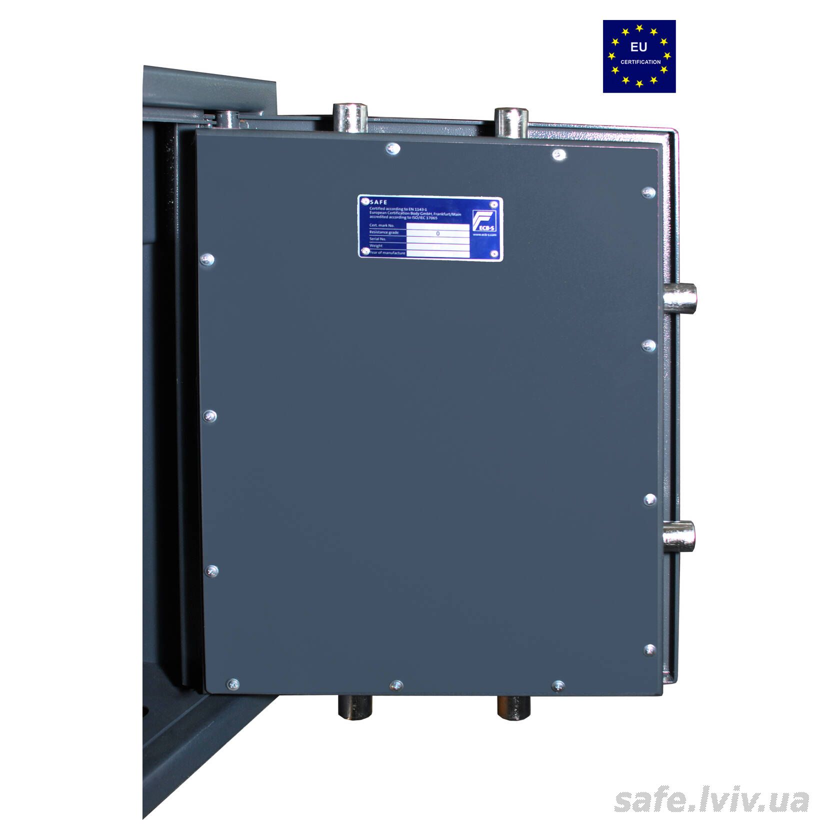 - Конструкція: корпус 20 мм (сталь - зламостійкий бетон - сталь); ригельна система тристороння, 6 ригелів Ø 25 мм.