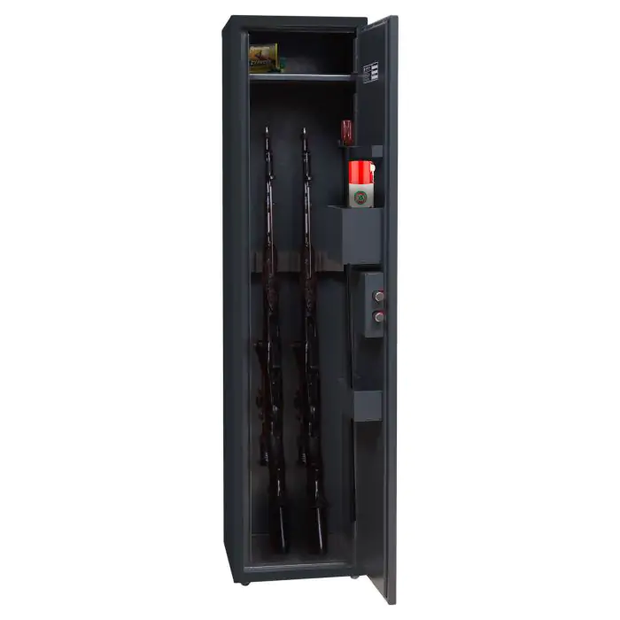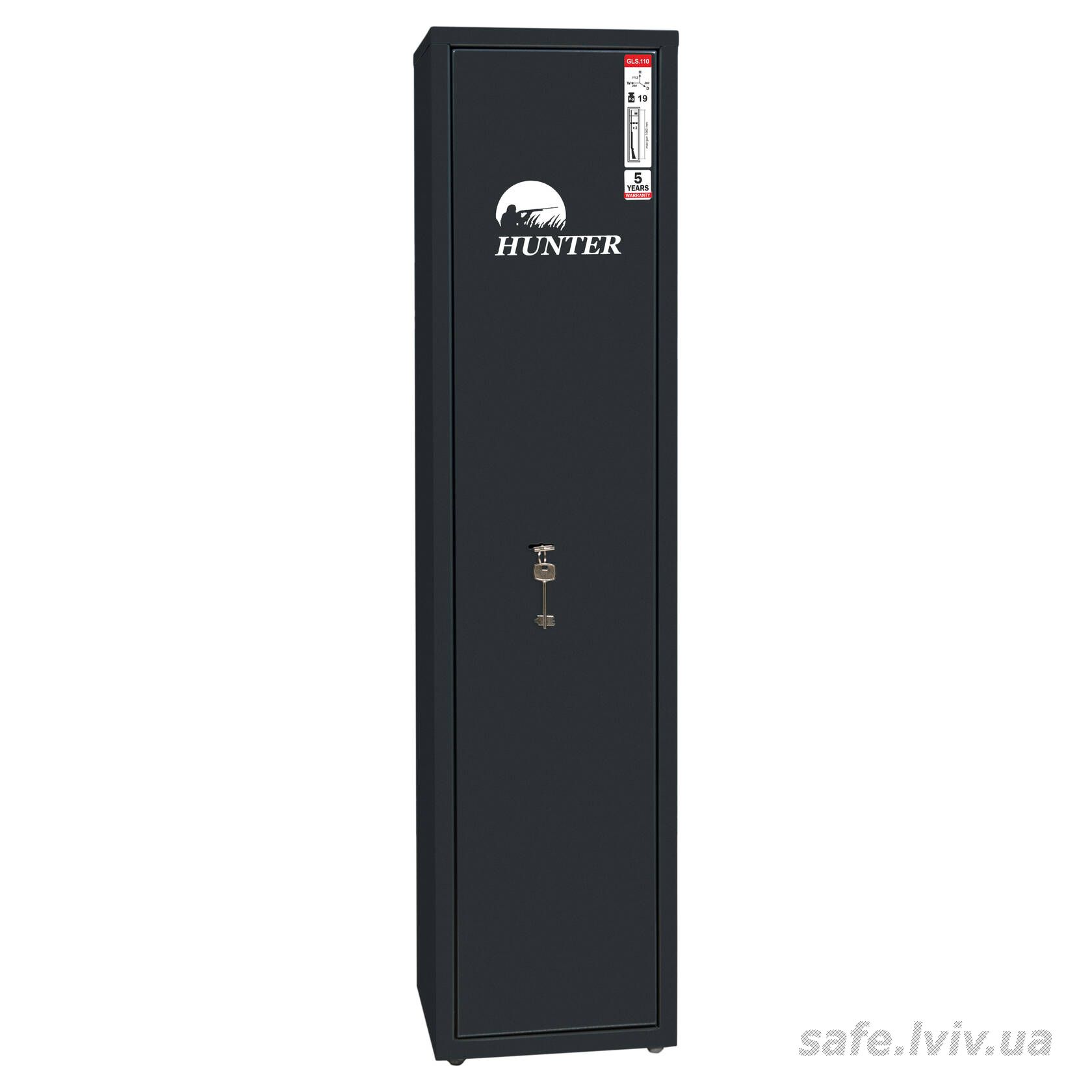 Hunter GLS.110.K це недорогий бюджетний сейф для зброї, призначений для зберігання гладкоствольної зброї, набоїв і аксесуарів у домі чи офісі. Конструкція корпусу 1.2 мм (сталь) і дверей 2.4 мм (сталь), протизламна дверна конструкція, ригельна система одностороння, 2 ригелі Ø 16 мм та замок ключовий забезпечують базовий рівень захисту. Передбачено анкерні вузли для фіксації до стіни.