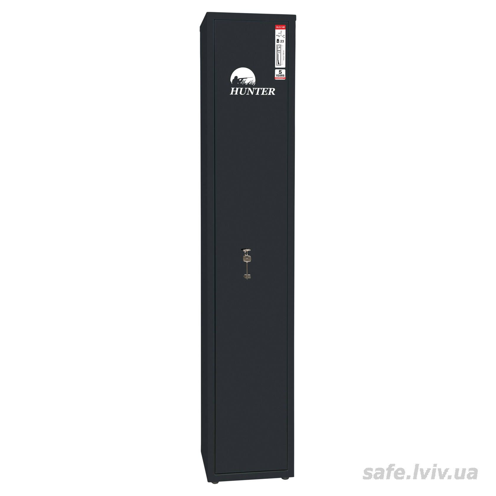 Hunter GLS.140.K це недорогий бюджетний сейф для зброї, призначений для зберігання гладкоствольної зброї, набоїв і аксесуарів у домі чи офісі. Конструкція корпусу 1.2 мм (сталь) і дверей 2.4 мм (сталь), протизламна дверна конструкція, ригельна система одностороння, 2 ригелі Ø 16 мм та замок ключовий забезпечують базовий рівень захисту. Передбачено анкерні вузли для фіксації до стіни.