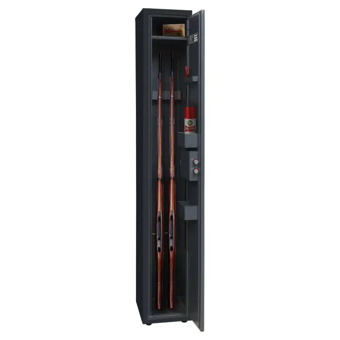 Hunter GLS.200.K це недорогий бюджетний сейф для зброї, призначений для зберігання гладкоствольної зброї, набоїв і аксесуарів у домі чи офісі. Конструкція корпусу 1.2 мм (сталь) і дверей 2.4 мм (сталь), протизламна дверна конструкція, ригельна система одностороння, 2 ригелі Ø 16 мм та замок ключовий забезпечують базовий рівень захисту. Передбачено анкерні вузли для фіксації до стіни.