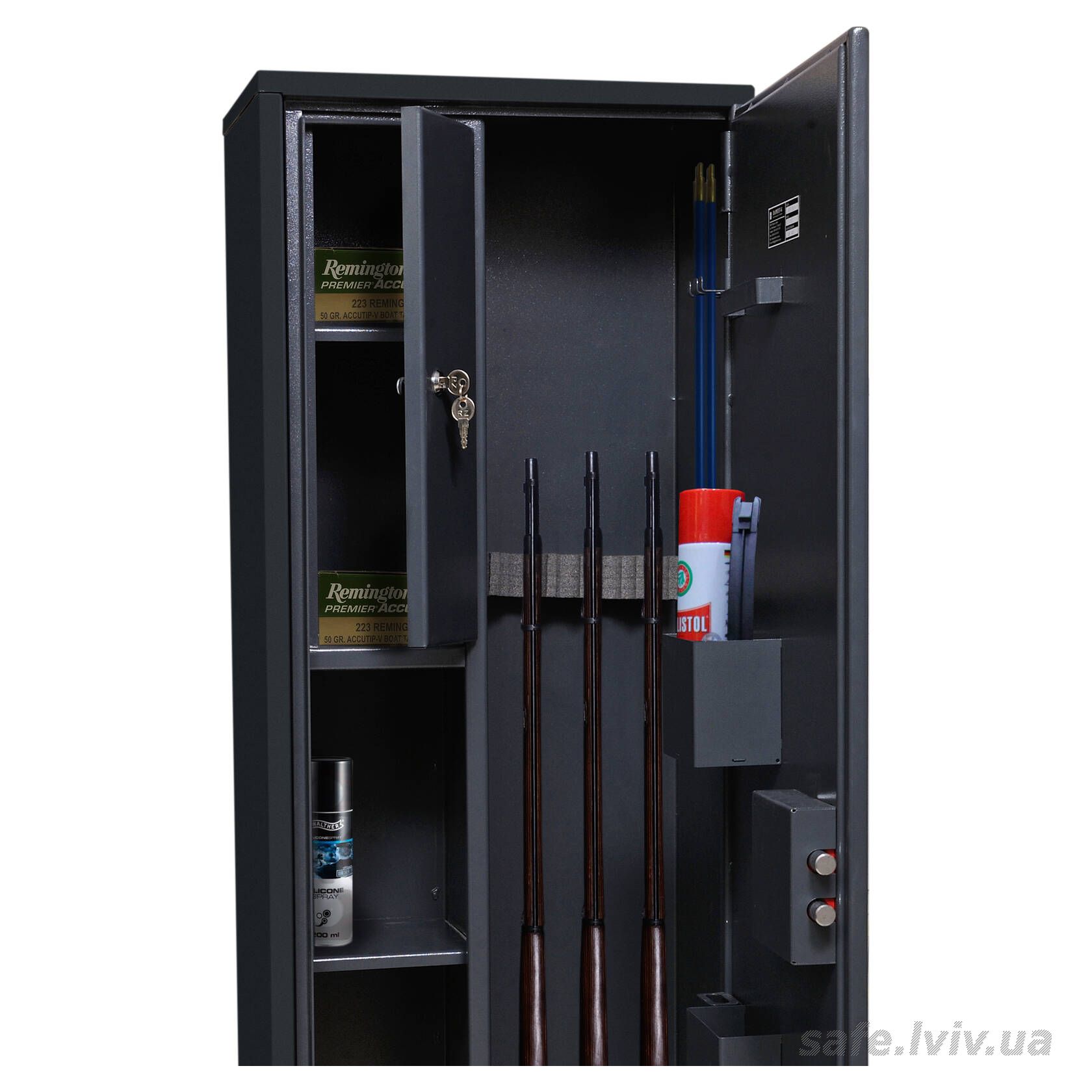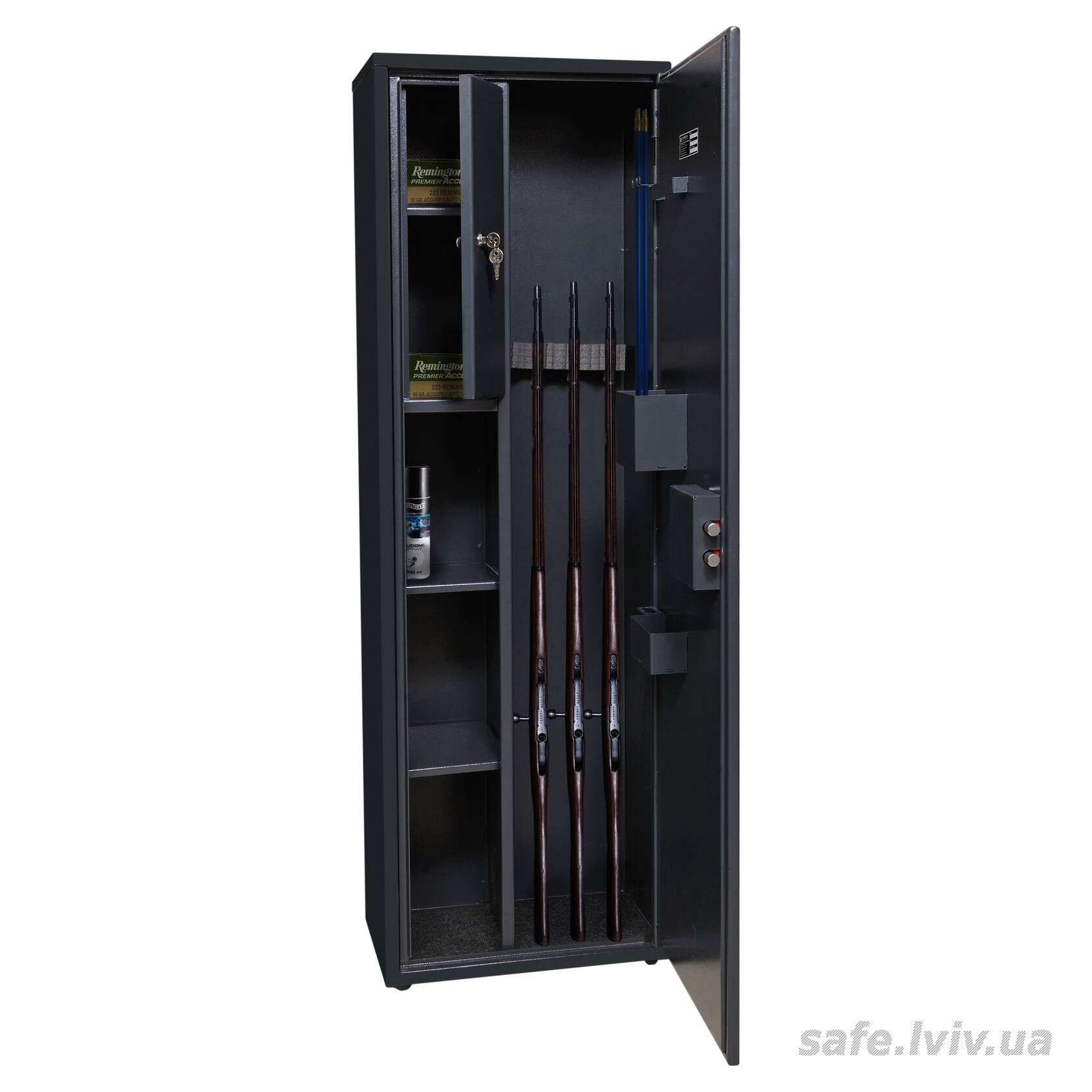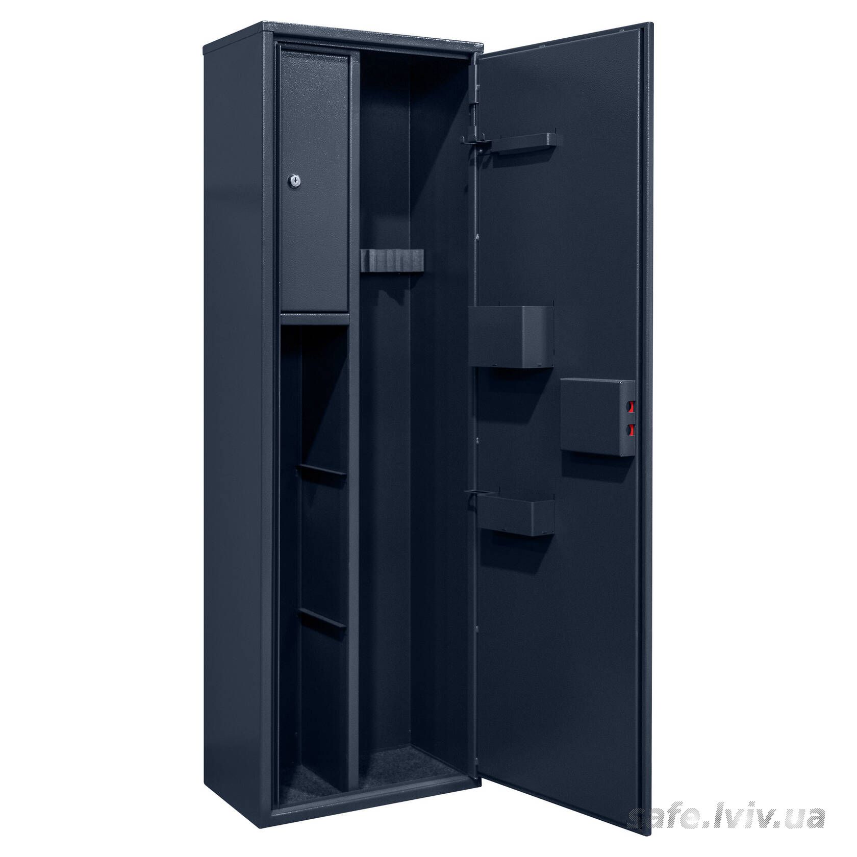 - Комплектація: тримачі для шомполів, зйомний магнітний ложемент, трейзер, 3 полиці, зйомні навісні елементи на дверях.