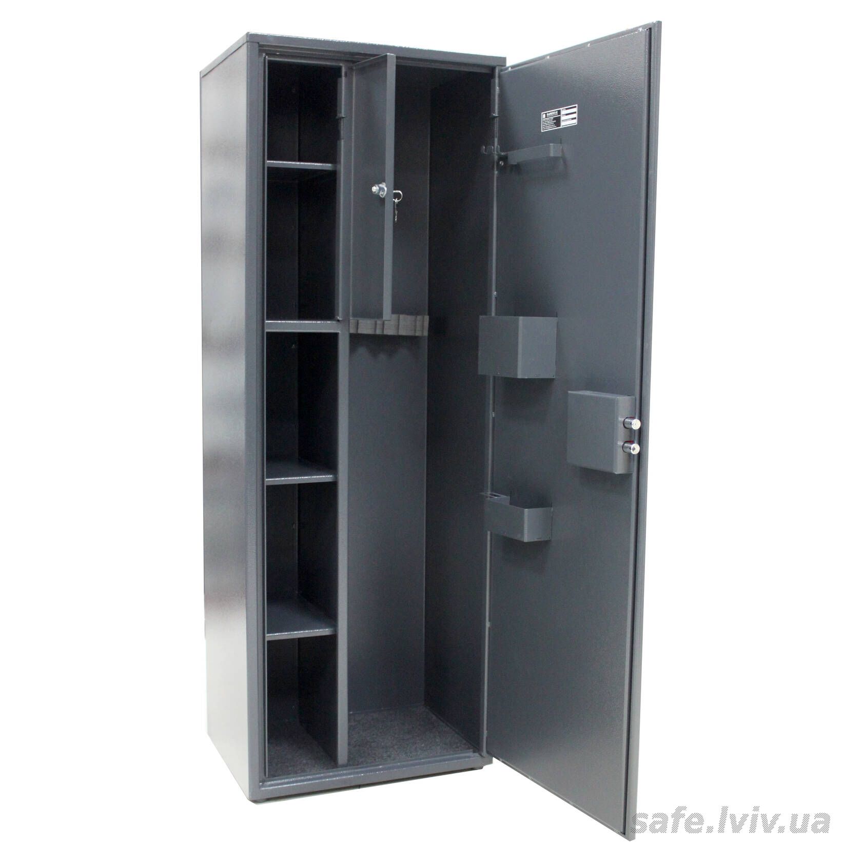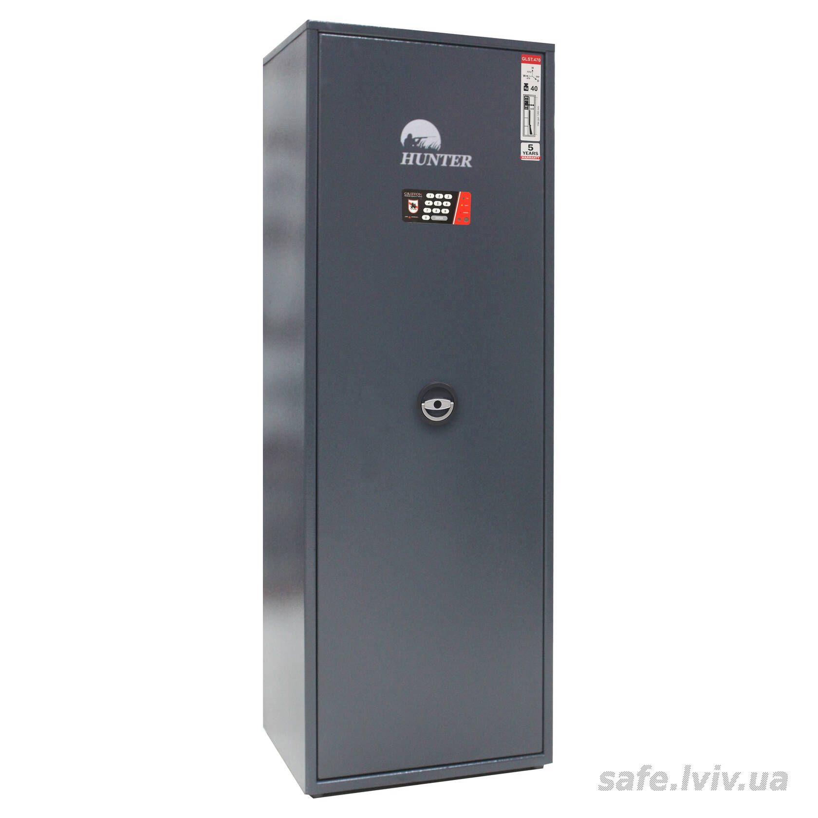 Hunter GLST.470.E це недорогий бюджетний сейф для зброї, призначений для зберігання гладкоствольної зброї, набоїв і аксесуарів у домі чи офісі. Конструкція корпусу 1.2 мм (сталь) і дверей 2.4 мм (сталь), протизламна дверна конструкція, ригельна система одностороння, 2 ригелі Ø 16 мм та замок електронний забезпечують базовий рівень захисту. Передбачено анкерні вузли для фіксації до стіни.
