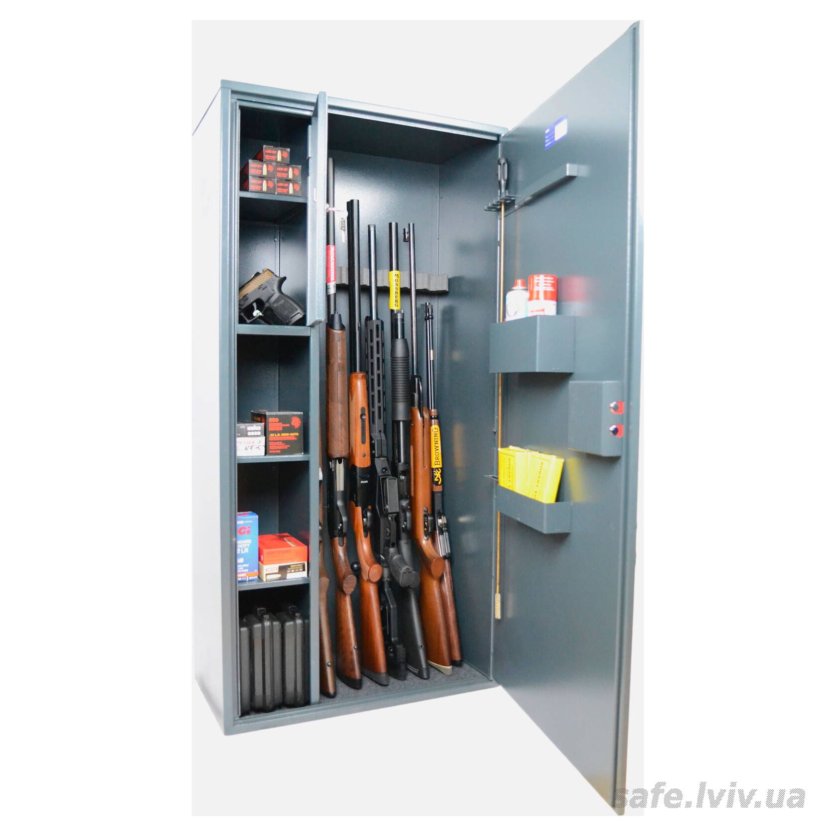- Комплектація: тримачі для шомполів, зйомний магнітний ложемент, трейзер, 3 полиці, зйомні навісні елементи на дверях.