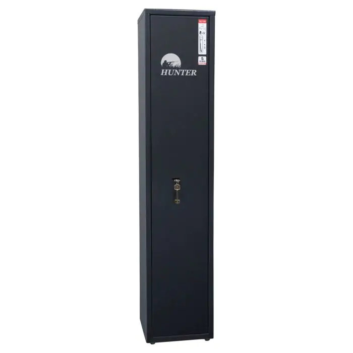 Hunter GLT.125.K це недорогий бюджетний сейф для зброї, призначений для зберігання гладкоствольної зброї, набоїв і аксесуарів у домі чи офісі. Конструкція корпусу 1.2 мм (сталь) і дверей 2.4 мм (сталь), протизламна дверна конструкція, ригельна система одностороння, 2 ригелі Ø 16 мм та замок ключовий забезпечують базовий рівень захисту. Передбачено анкерні вузли для фіксації до стіни.