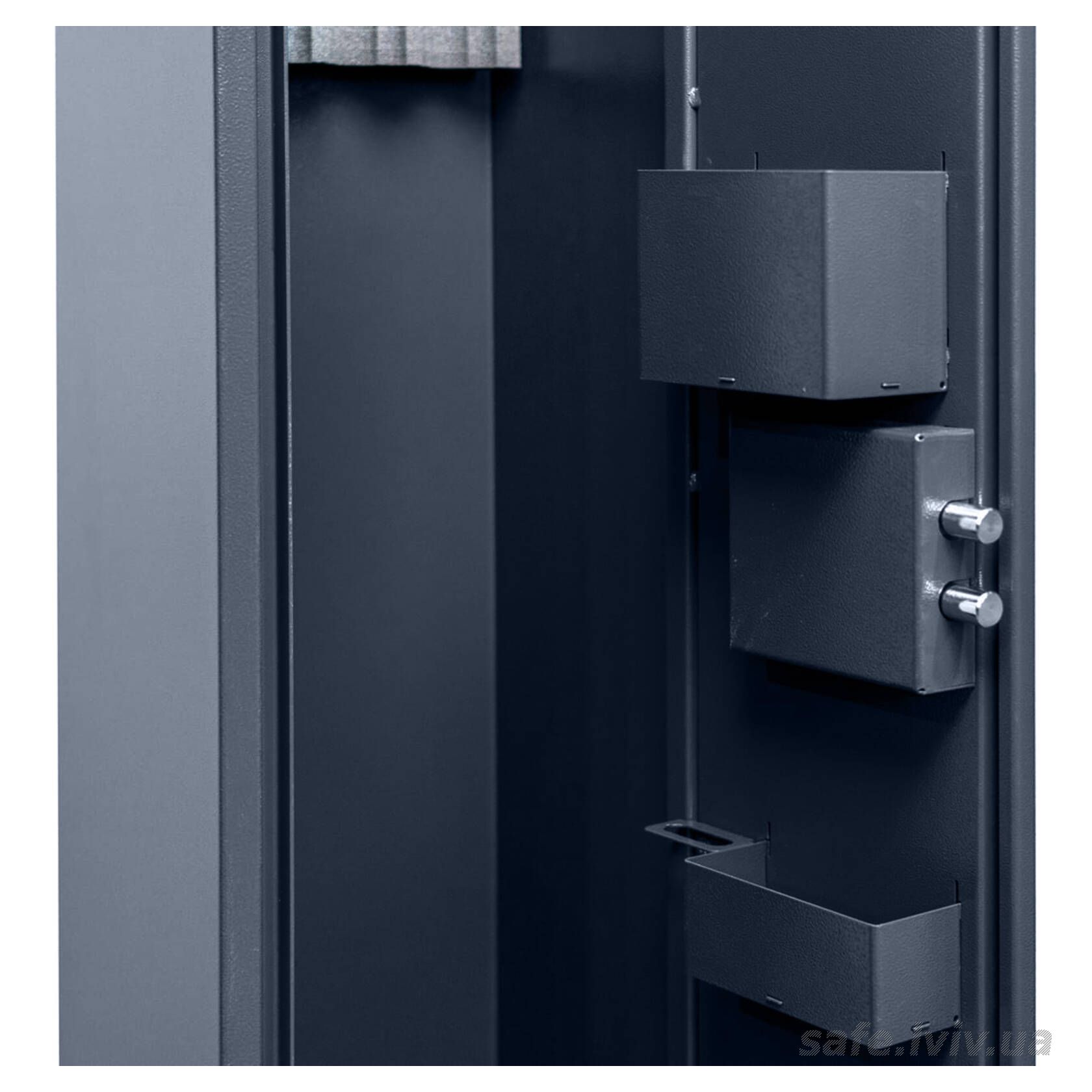 - Конструкція: корпус 1.2 мм (сталь), двері 2.4 мм (сталь); протизламна конструкція дверей; анкерні вузли для кріплення до стіни.