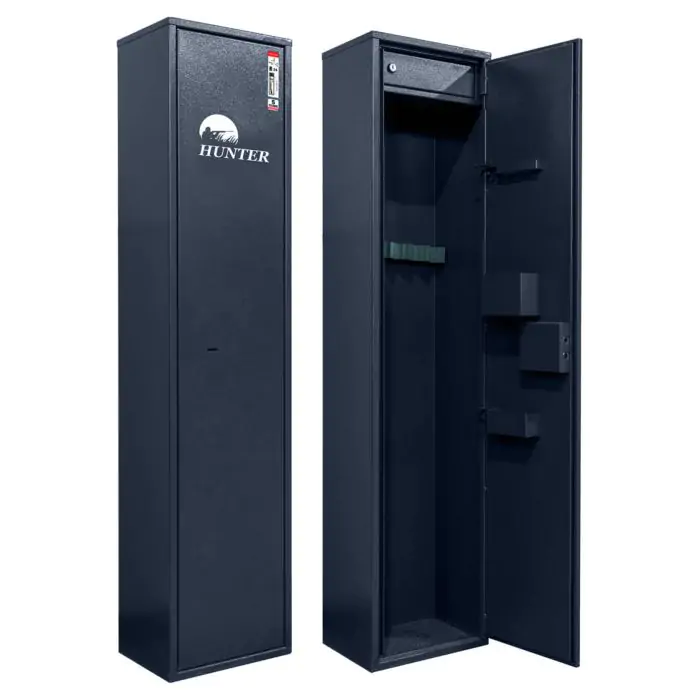 Hunter GLT.340.K це недорогий бюджетний сейф для зброї, призначений для зберігання гладкоствольної зброї, набоїв і аксесуарів у домі чи офісі. Конструкція корпусу 1.2 мм (сталь) і дверей 2.4 мм (сталь), протизламна дверна конструкція, ригельна система одностороння, 2 ригелі Ø 16 мм та замок ключовий забезпечують базовий рівень захисту. Передбачено анкерні вузли для фіксації до стіни.
