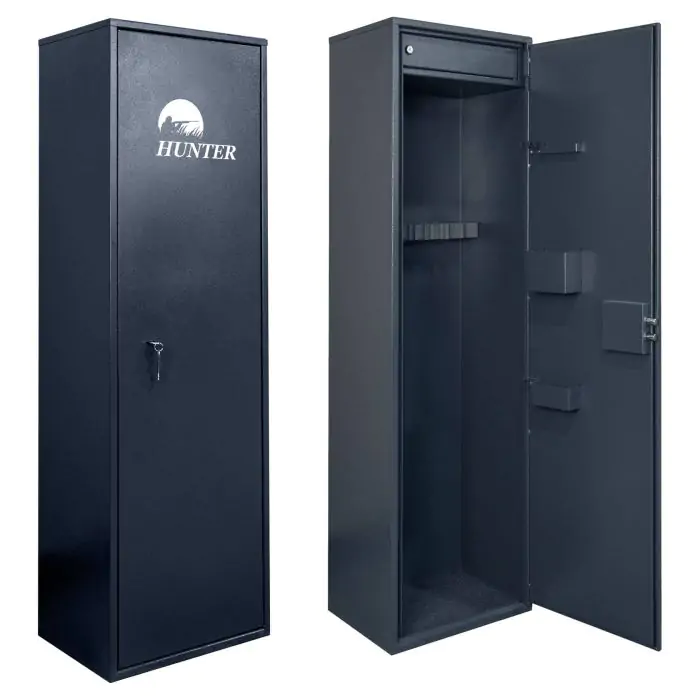Hunter GLT.470.K це недорогий бюджетний сейф для зброї, призначений для зберігання гладкоствольної зброї, набоїв і аксесуарів у домі чи офісі. Конструкція корпусу 1.2 мм (сталь) і дверей 2.4 мм (сталь), протизламна дверна конструкція, ригельна система одностороння, 2 ригелі Ø 16 мм та замок ключовий забезпечують базовий рівень захисту. Передбачено анкерні вузли для фіксації до стіни.