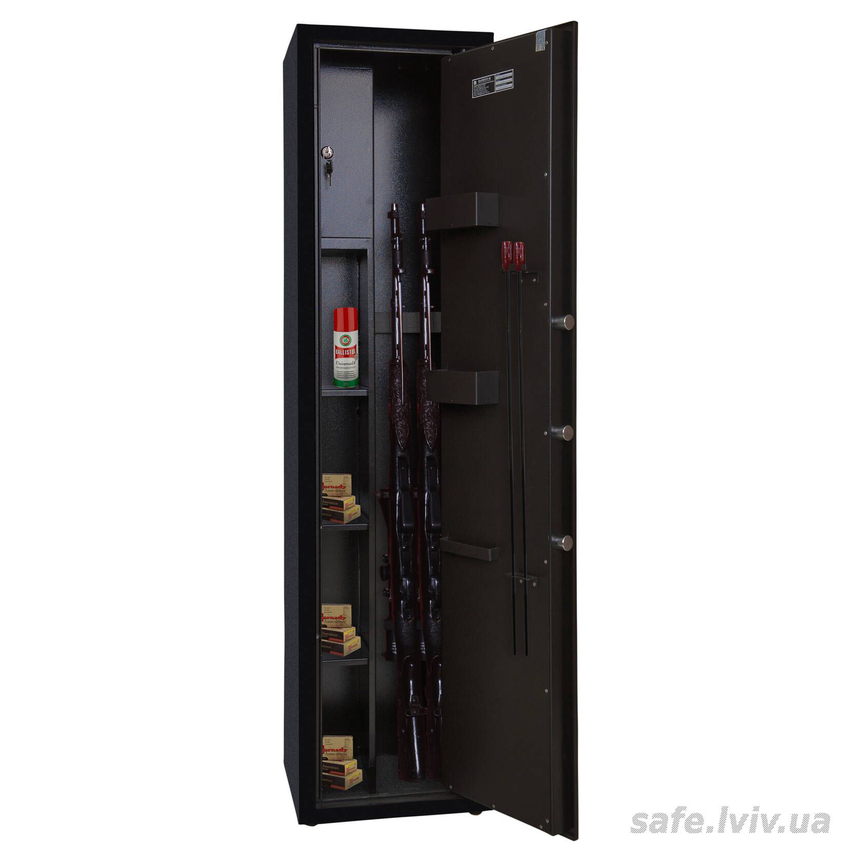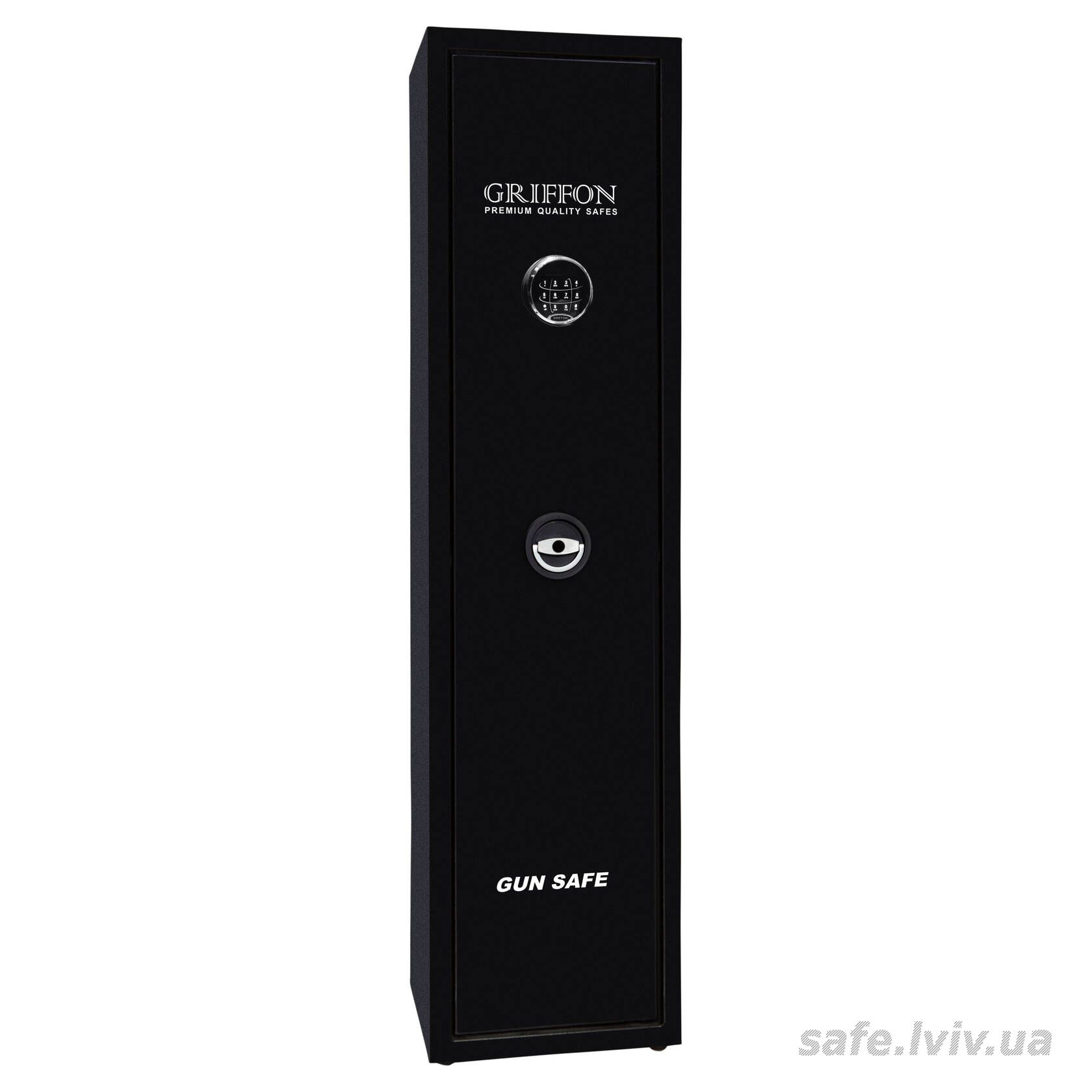 Griffon GS.140.E BLACK це збройовий сейф для мисливської та спортивної зброї, який відповідає вимогам МВС України щодо зберігання вогнепальної зброї. Базовий захист забезпечує конструкція корпусу 1.5 мм (сталь), дверей 3 мм (сталь), ригельна система одностороння, 3 ригелі Ø 25 мм, антизламна система зачіп і внутрішня петля-антизріз; замок - електронний Q1 (Китай). Усередині передбачено оснащення для аксесуарів. Сейф вміщає 3 одиниць зброї довжиною до 1350 мм.