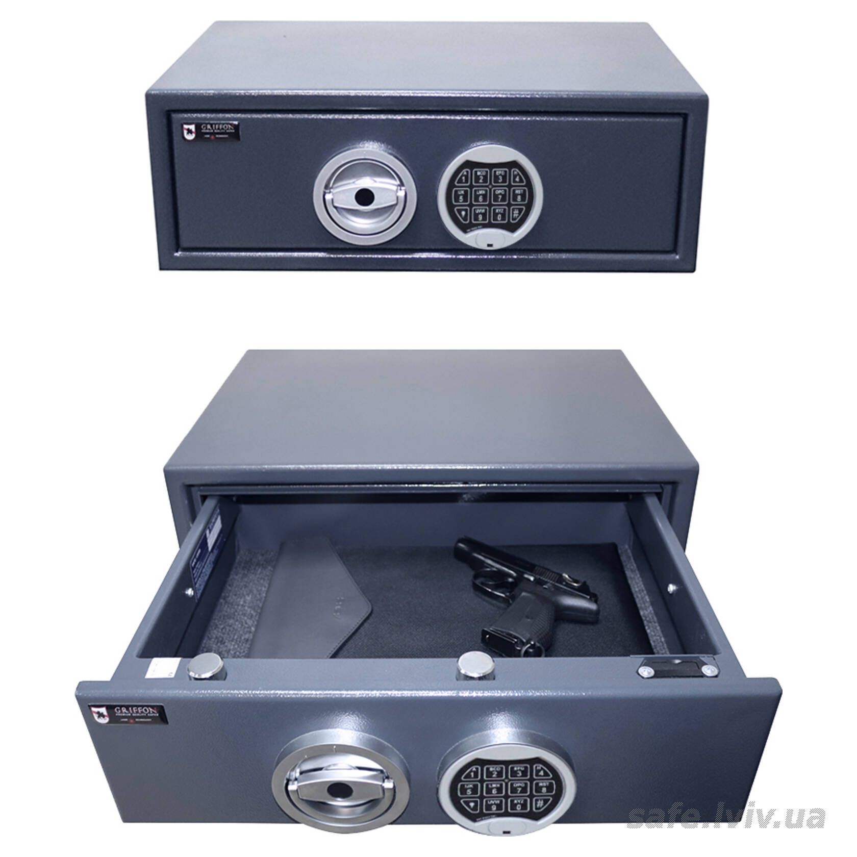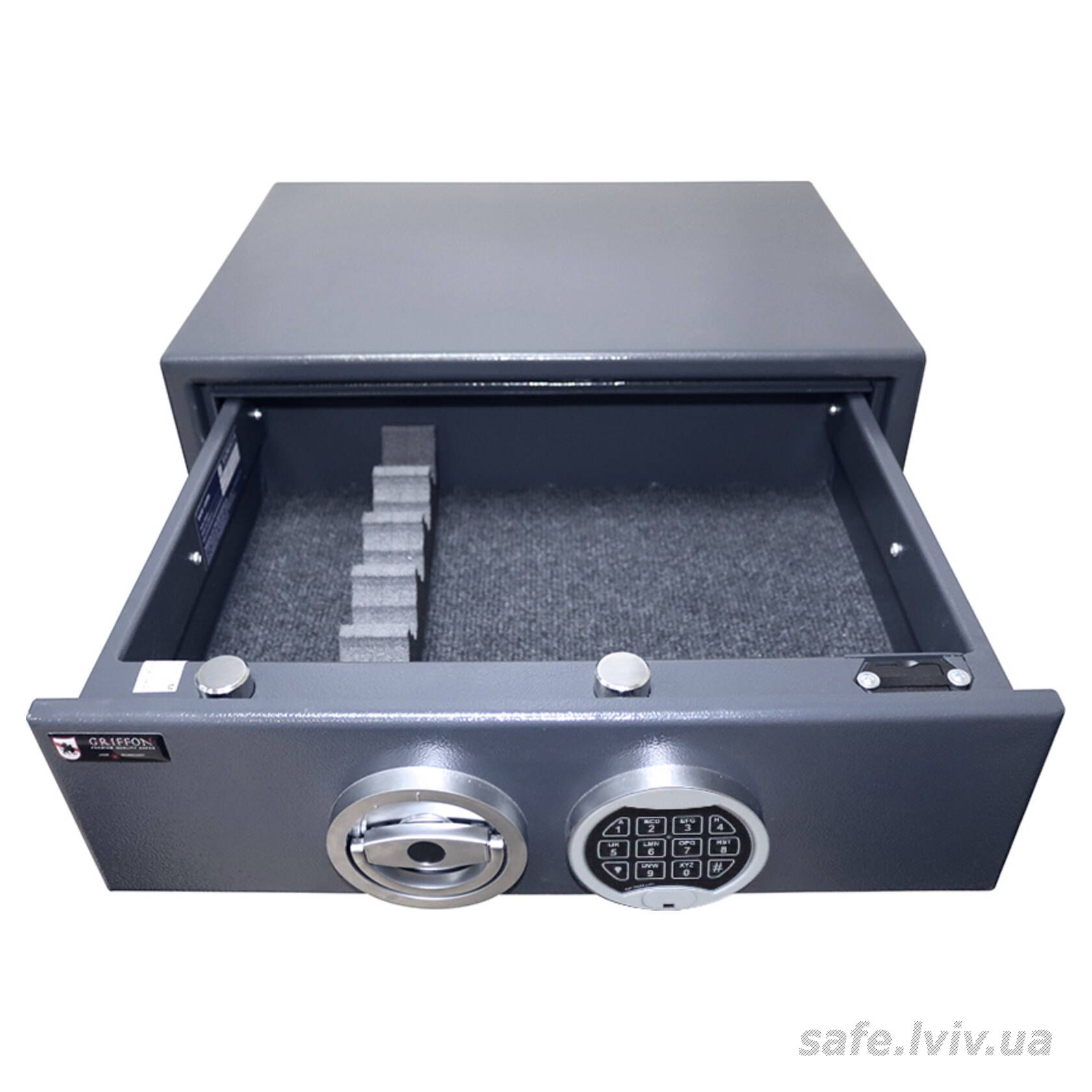 Griffon GU.50.E це горизонтальний сейф клас S1 за EN 14450 у форматі шухляди, призначений для прихованого вбудовування в меблі для зберігання зброї, ноутбуків, документів і цінностей у домі або офісі. Зламостійкість забезпечує конструкція корпусу 3 мм (сталь), дверей 3 мм (сталь), ригельна система тристороння, 4 ригелі Ø 25 мм та замок електронний M-LOCKS (Нідерланди) VdS Class 2 (B). Конструкція передбачає швидкий доступ і зручний монтаж під ліжком, у тумбі або шафі.