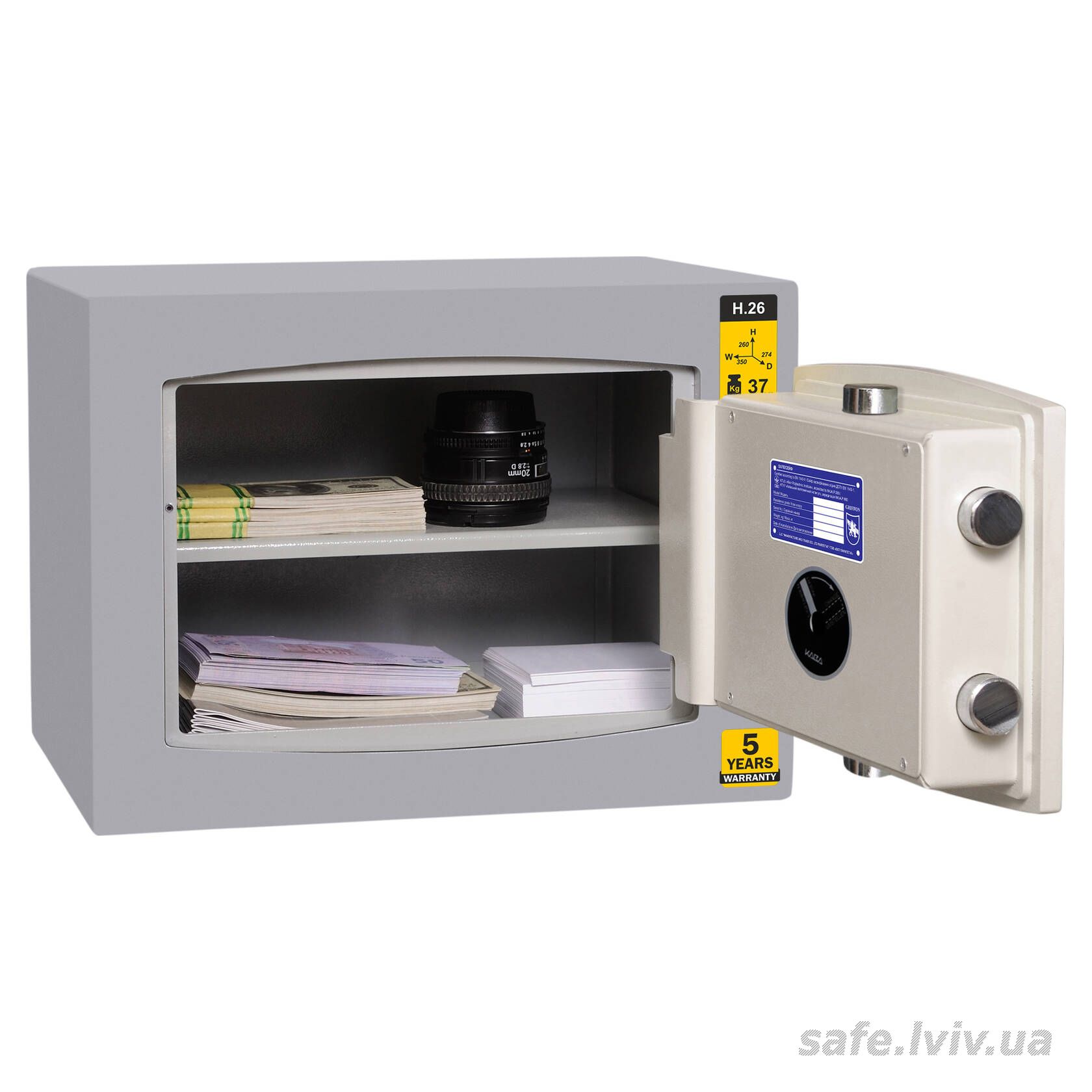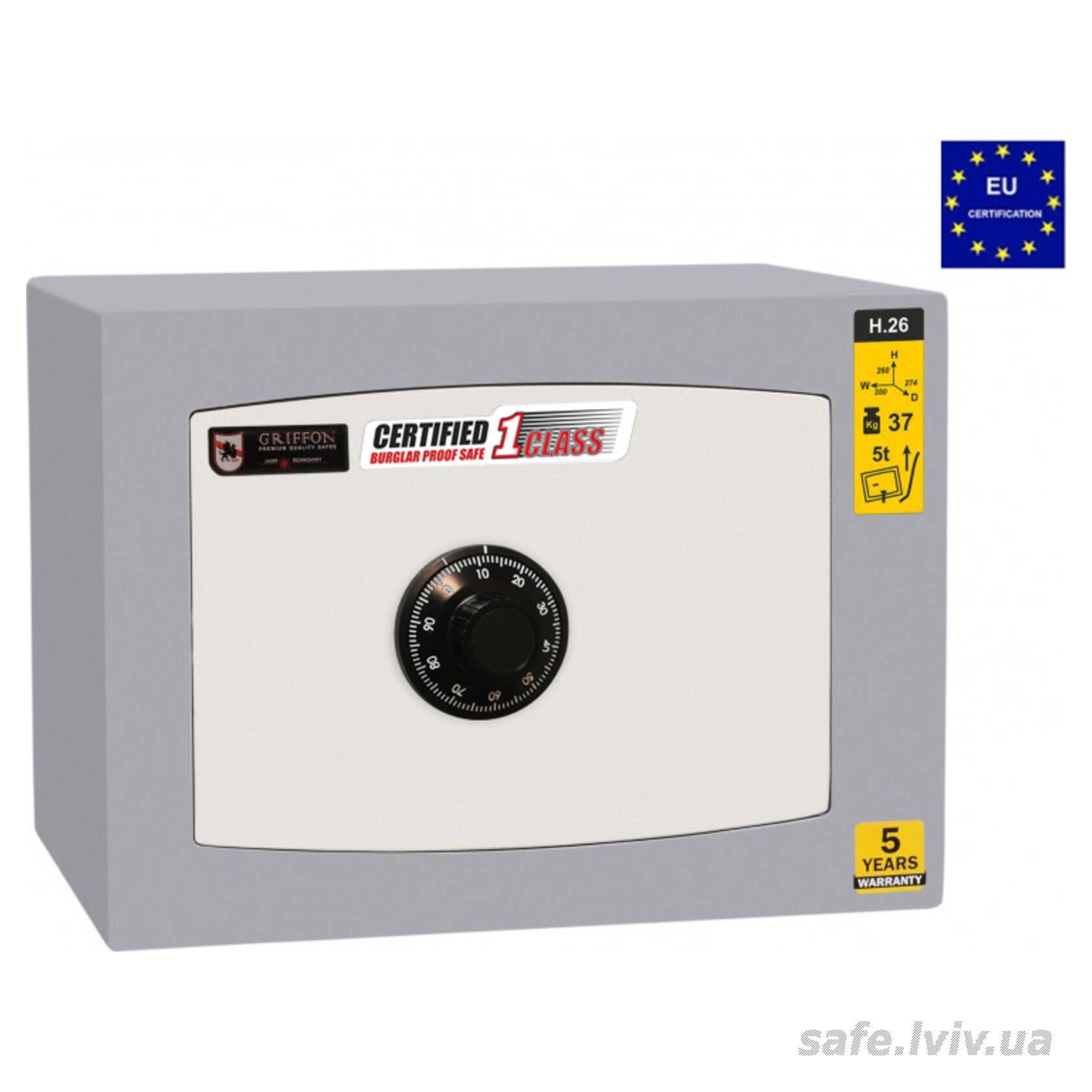 Griffon H.26.C це сертифікований зламостійкий сейф клас I за EN 1143-1 та без вогнестійкості, призначений для зберігання грошей, документів, прикрас і цінностей у домі або офісі. Зламостійкість забезпечує конструкція корпусу 25 мм (сталь - зламостійкий бетон - сталь), дверей 14 мм (сталь), ригельна система тристороння, 4 ригелі Ø 25 мм та замок кодовий механічний La GARD (США) VdS Class 1 (A). Рекомендовані ліміти зберігання - до 2000 мінімальних зарплат для особистого користування та до 1000 для комерційного.