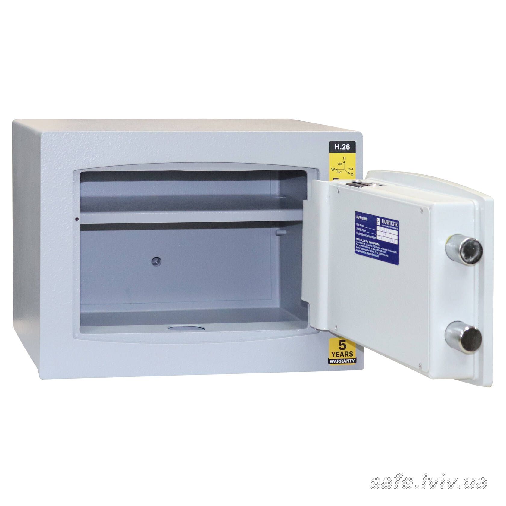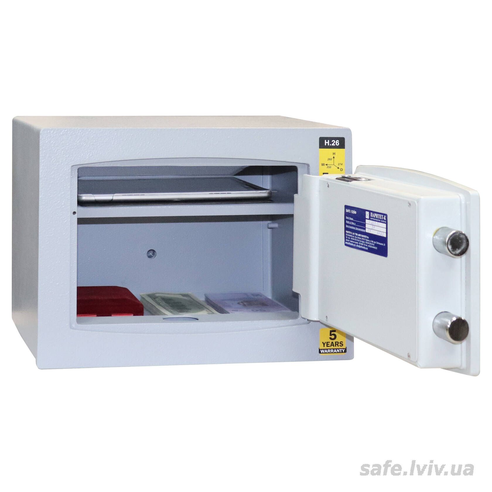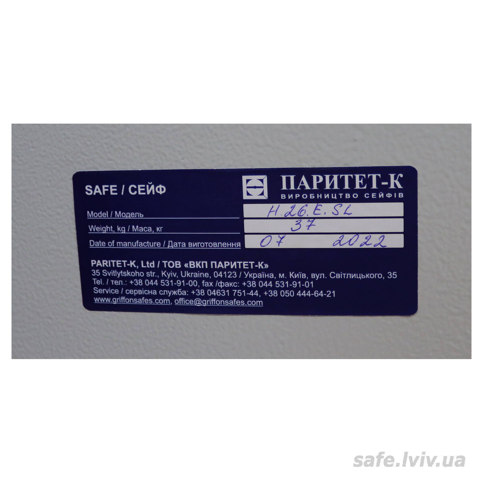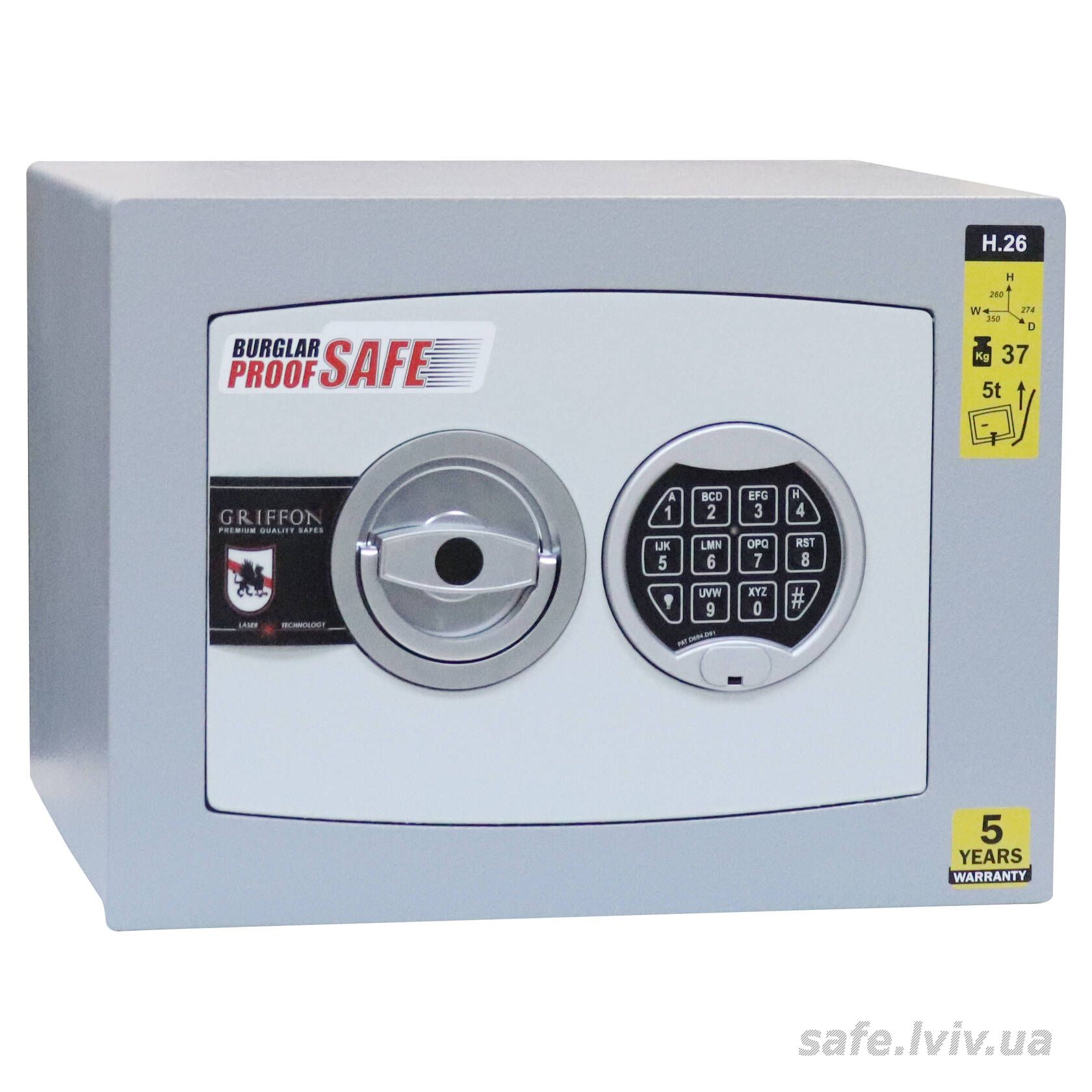 Griffon H.26.E SL це сертифікований зламостійкий сейф клас I за EN 1143-1 та без вогнестійкості, призначений для зберігання грошей, документів, прикрас і цінностей у домі або офісі. Зламостійкість забезпечує конструкція корпусу 25 мм (сталь - зламостійкий бетон - сталь), дверей 14 мм (сталь), ригельна система тристороння, 4 ригелі Ø 25 мм та замок електронний SMARTLOCK (Італія) VdS Class 1 (A). Рекомендовані ліміти зберігання - до 2000 мінімальних зарплат для особистого користування та до 1000 для комерційного.