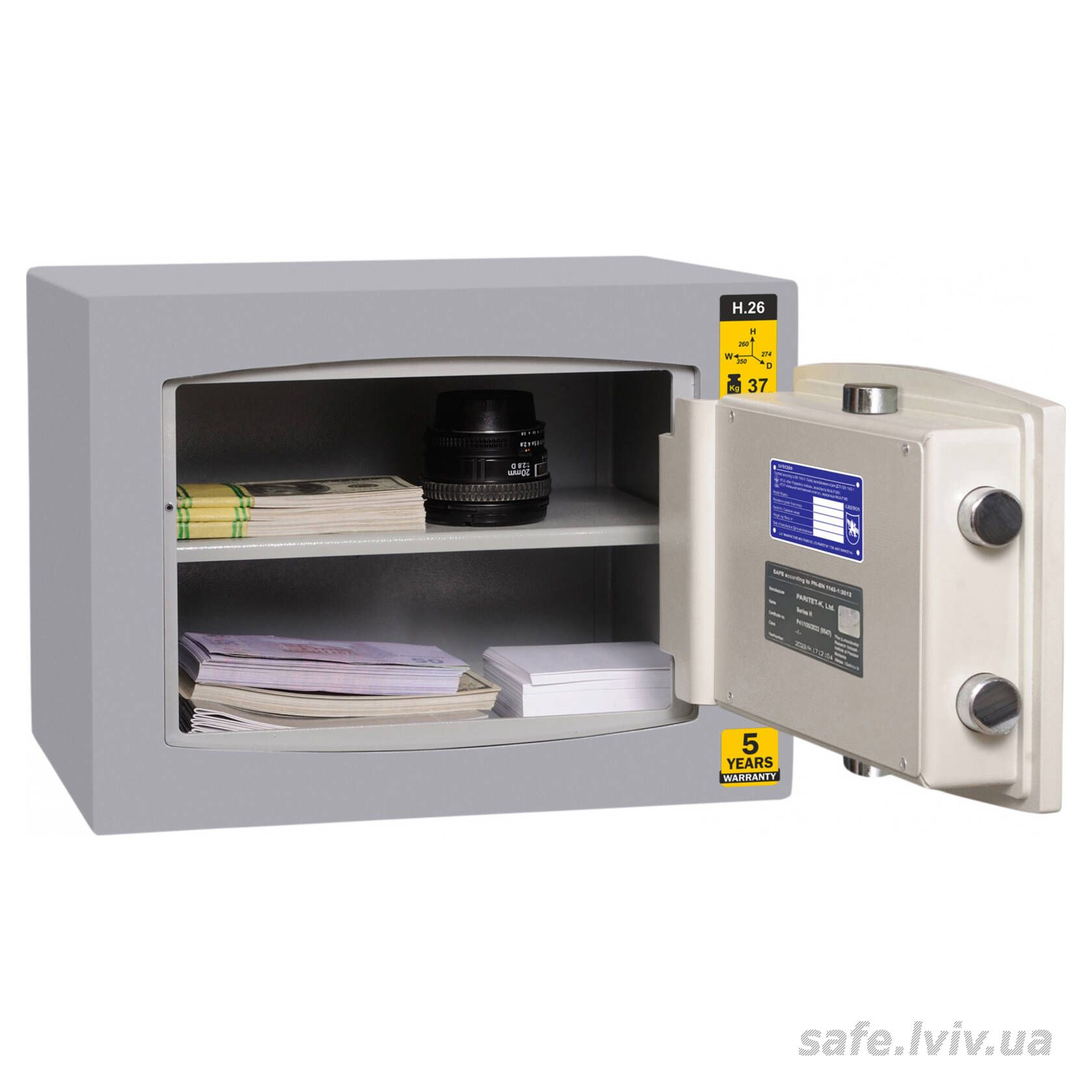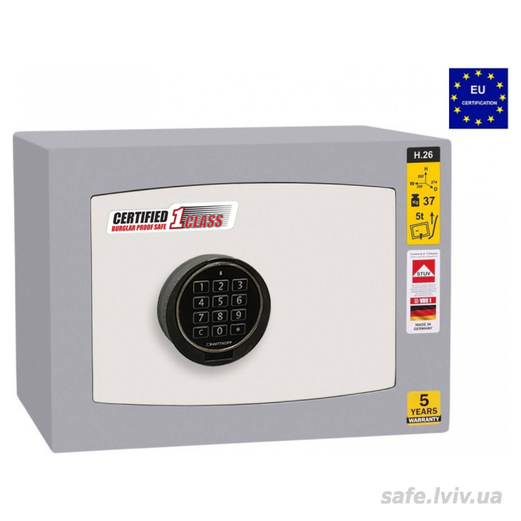 Griffon H.26.E WKP це сертифікований зламостійкий сейф клас I за EN 1143-1 та без вогнестійкості, призначений для зберігання грошей, документів, прикрас і цінностей у домі або офісі. Зламостійкість забезпечує конструкція корпусу 25 мм (сталь - зламостійкий бетон - сталь), дверей 14 мм (сталь), ригельна система тристороння, 4 ригелі Ø 25 мм та замок електронний Carl Wittkopp (Німеччина) VdS Class 2 (B). Рекомендовані ліміти зберігання - до 2000 мінімальних зарплат для особистого користування та до 1000 для комерційного.