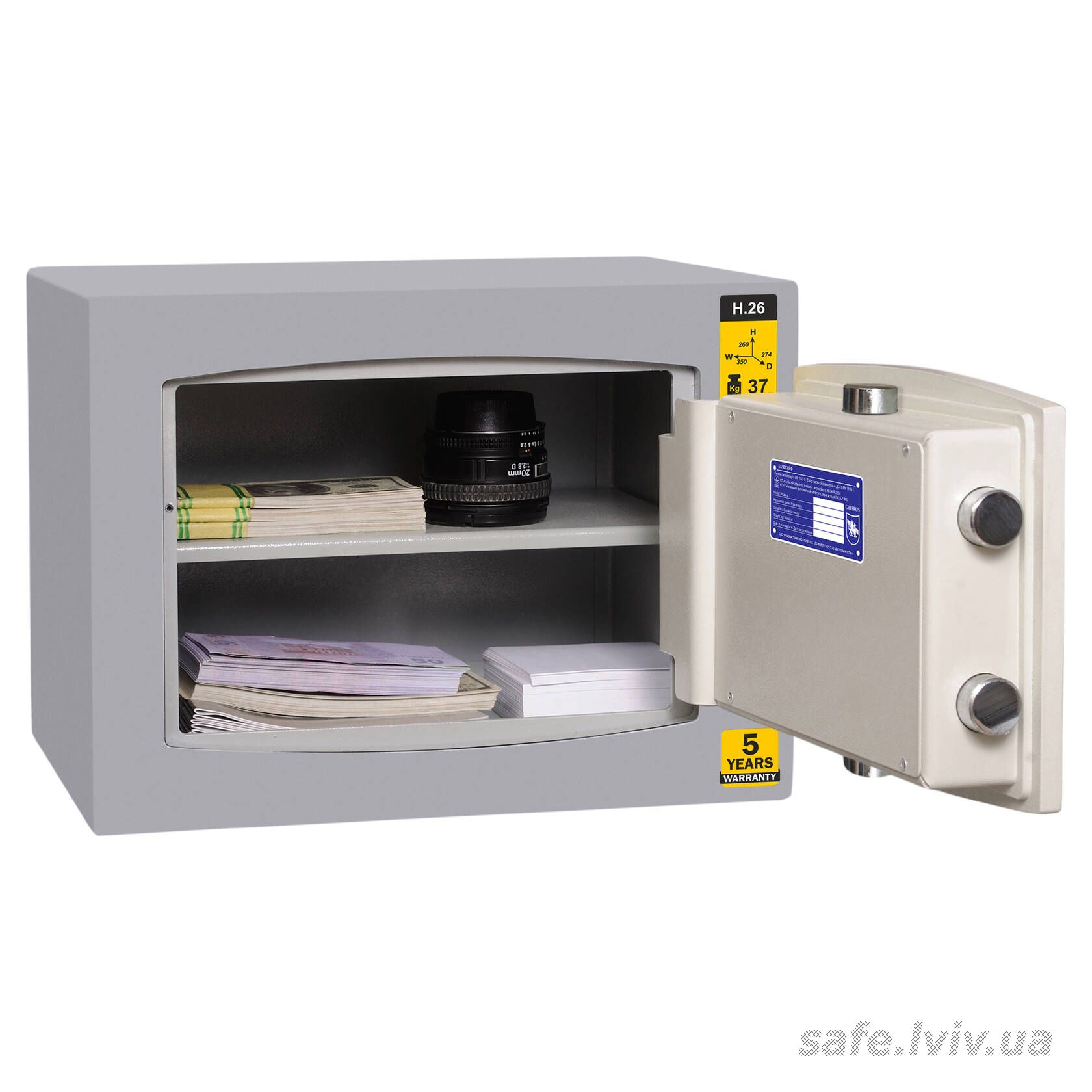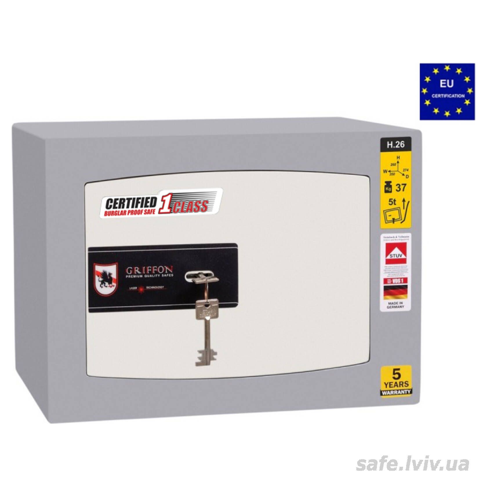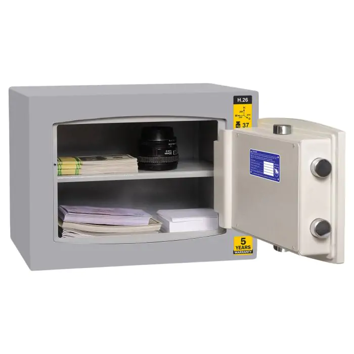 Griffon H.26.K це сертифікований зламостійкий сейф клас I за EN 1143-1 та без вогнестійкості, призначений для зберігання грошей, документів, прикрас і цінностей у домі або офісі. Зламостійкість забезпечує конструкція корпусу 25 мм (сталь - зламостійкий бетон - сталь), дверей 14 мм (сталь), ригельна система тристороння, 4 ригелі Ø 25 мм та замок ключовий STUV (Німеччина) VdS Class 1 (A). Рекомендовані ліміти зберігання - до 2000 мінімальних зарплат для особистого користування та до 1000 для комерційного.
