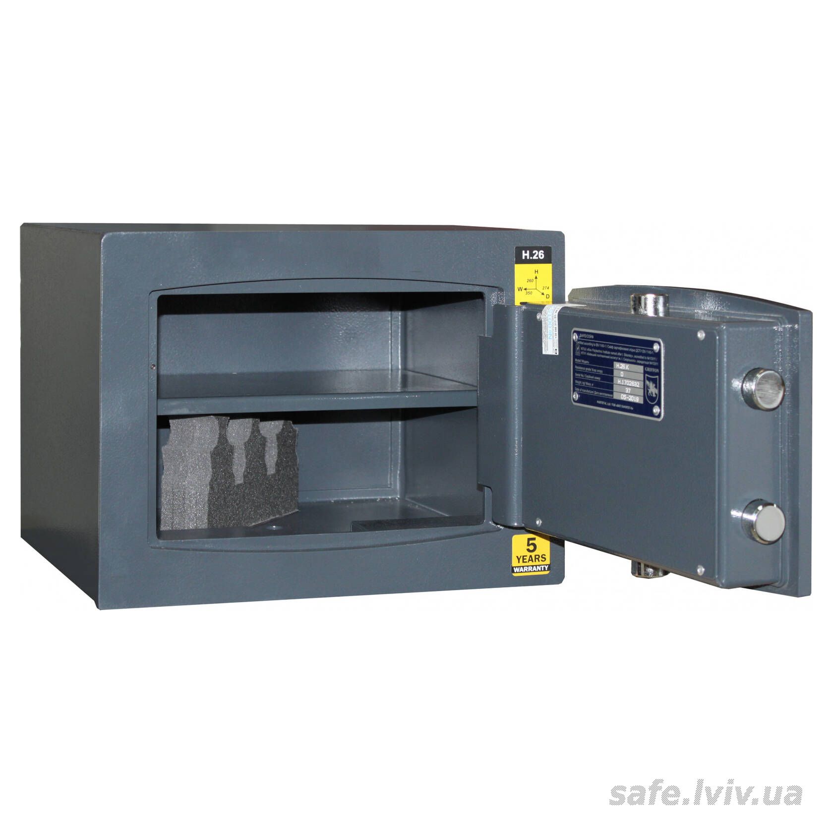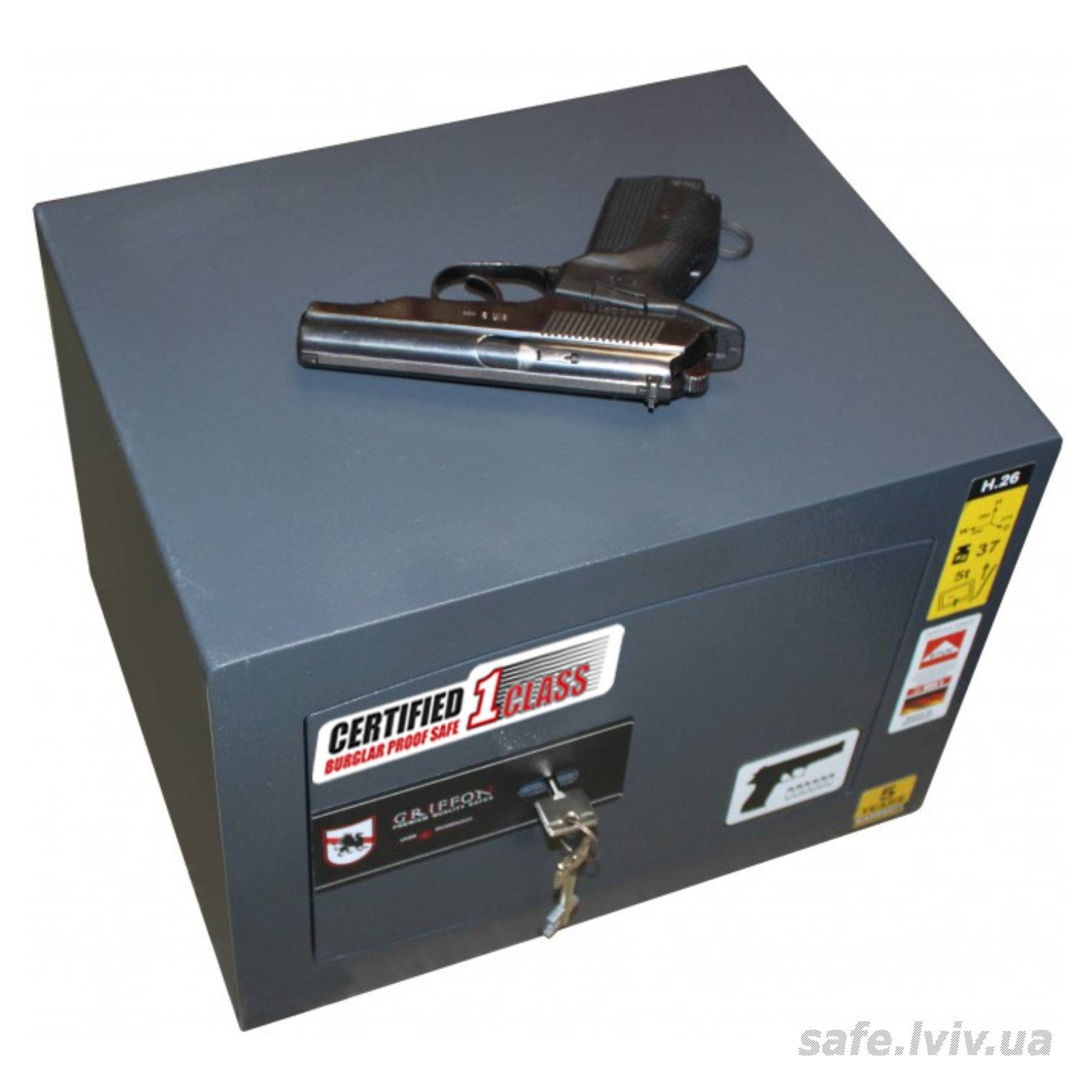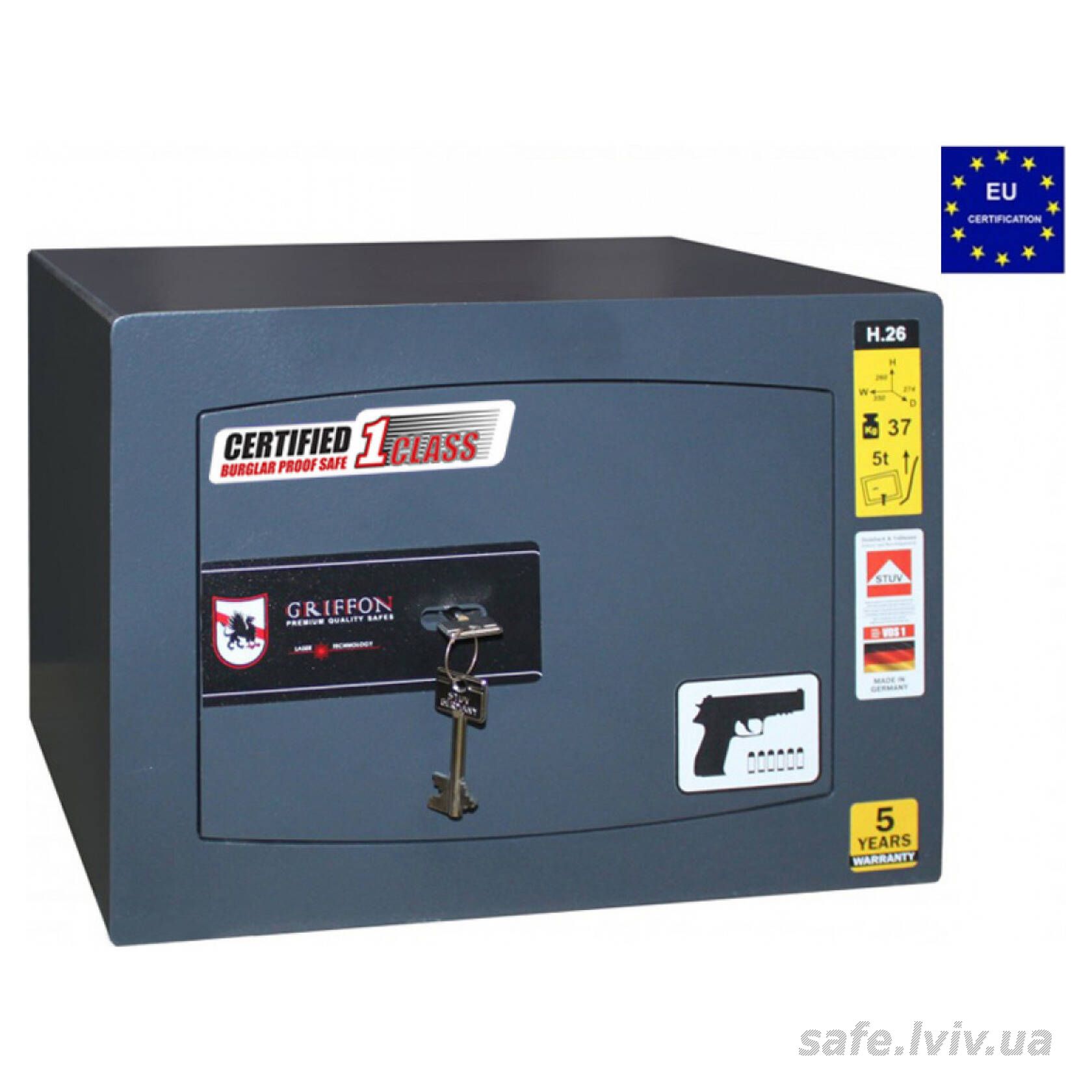 Griffon H.26.KP Dark Grey це сертифікований зламостійкий сейф клас I за EN 1143-1 та без вогнестійкості, призначений для зберігання грошей, документів, прикрас і цінностей у домі або офісі. Зламостійкість забезпечує конструкція корпусу 25 мм (сталь - зламостійкий бетон - сталь), дверей 14 мм (сталь), ригельна система тристороння, 4 ригелі Ø 25 мм та замок ключовий STUV (Німеччина) VdS Class 1 (A). Рекомендовані ліміти зберігання - до 2000 мінімальних зарплат для особистого користування та до 1000 для комерційного.