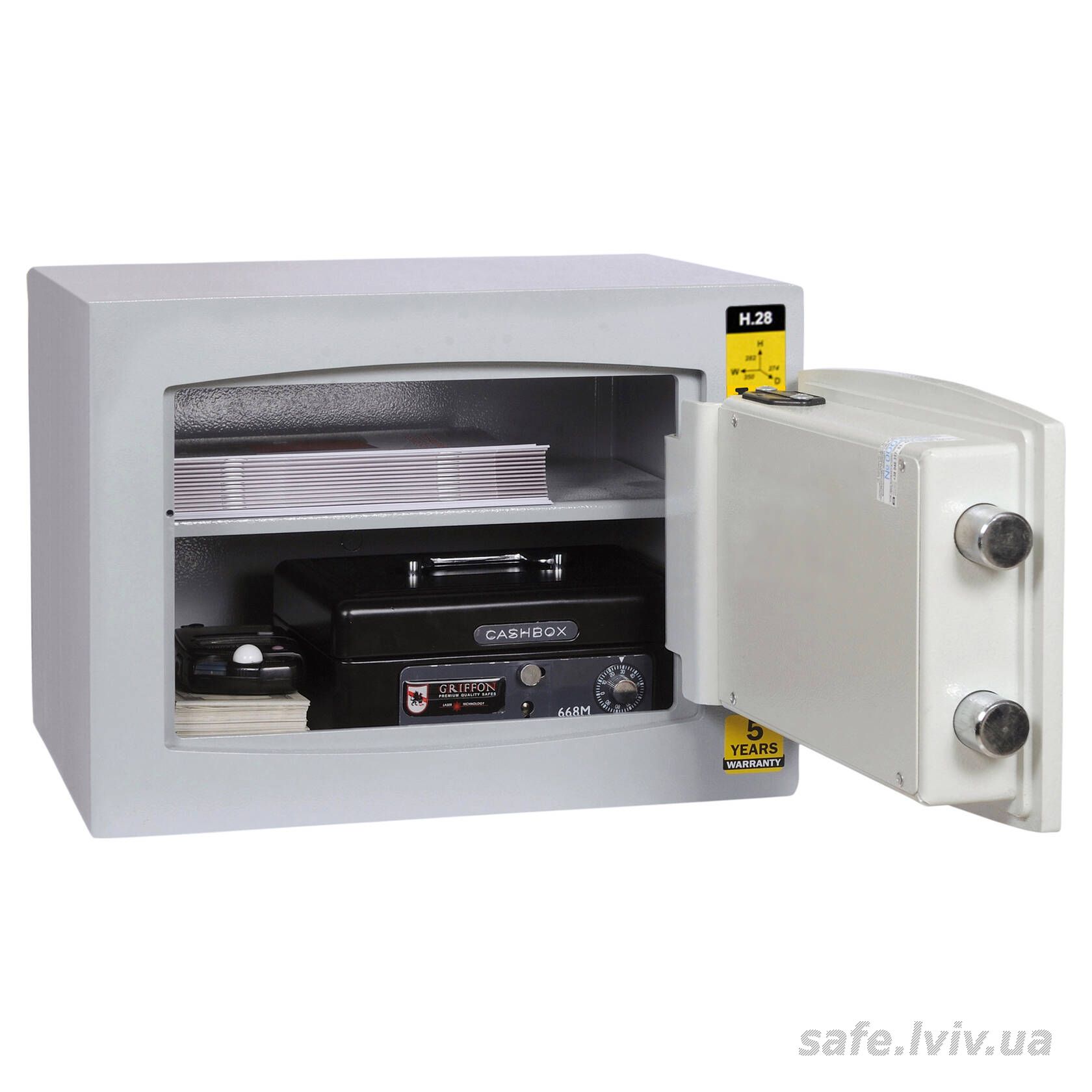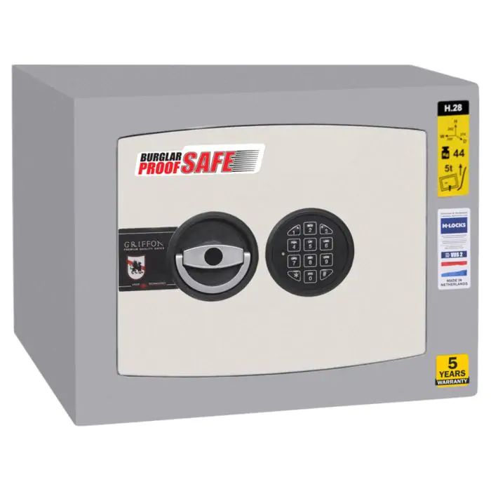 Griffon H.28.E це сертифікований зламостійкий сейф клас I за EN 1143-1 та без вогнестійкості, призначений для зберігання грошей, документів, прикрас і цінностей у домі або офісі. Зламостійкість забезпечує конструкція корпусу 25 мм (сталь - зламостійкий бетон - сталь), дверей 14 мм (сталь), ригельна система тристороння, 4 ригелі Ø 25 мм та замок електронний M-LOCKS (Нідерланди) VdS Class 2 (B). Рекомендовані ліміти зберігання - до 2000 мінімальних зарплат для особистого користування та до 1000 для комерційного.