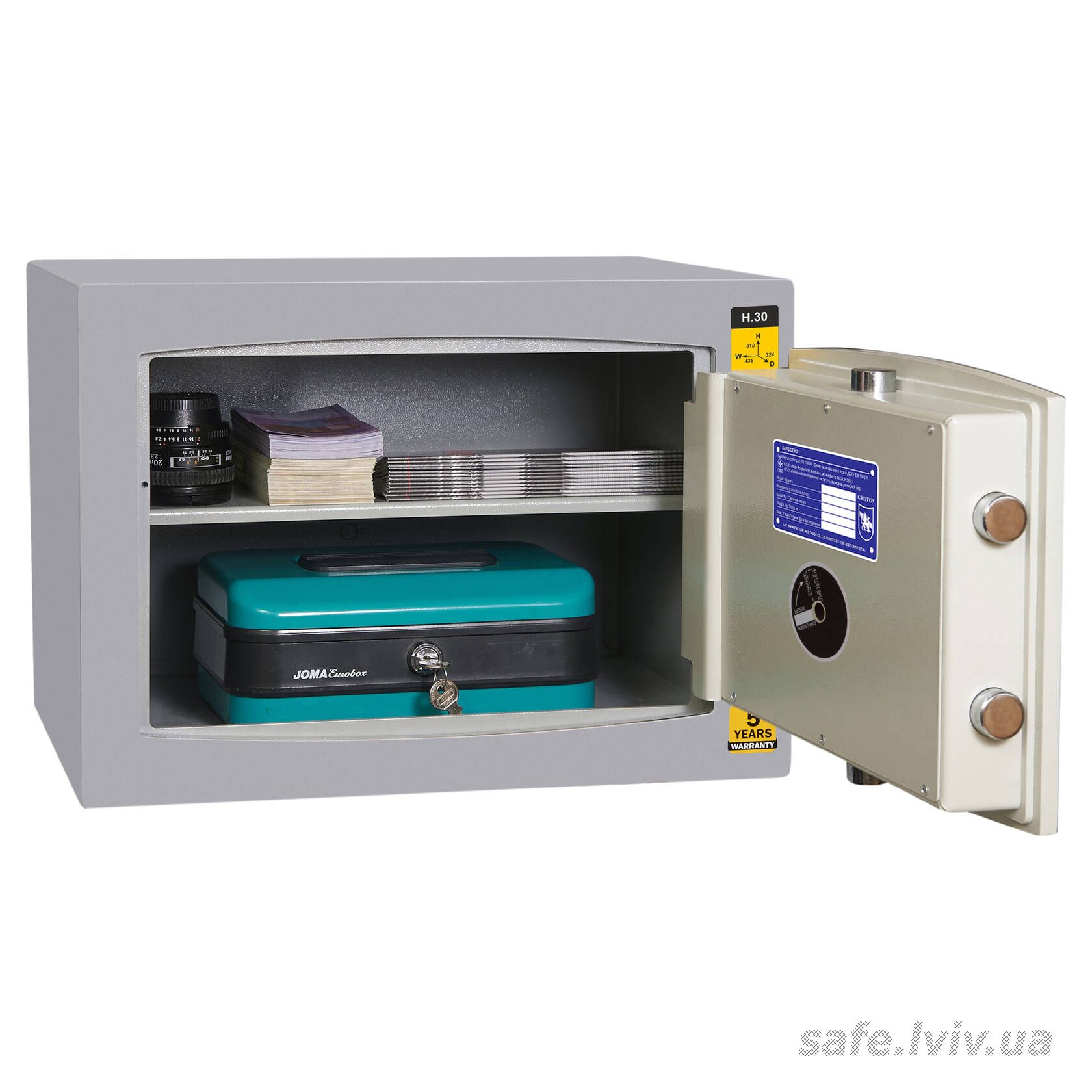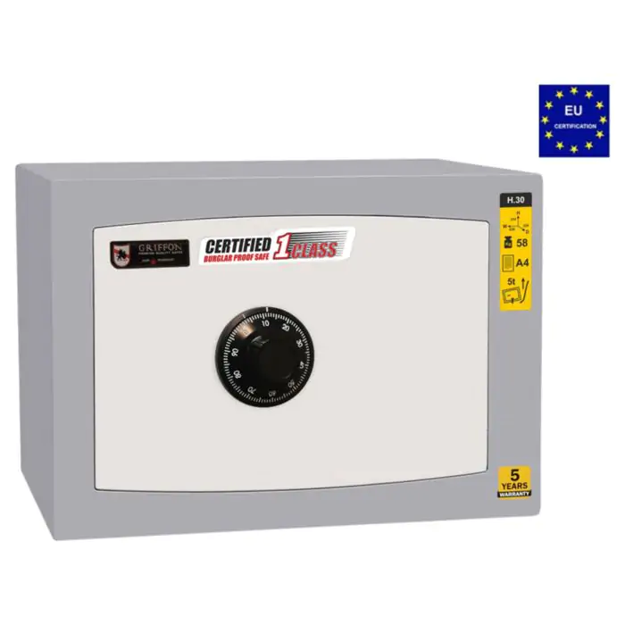 Griffon H.30.C це сертифікований зламостійкий сейф клас I за EN 1143-1 та без вогнестійкості, призначений для зберігання грошей, документів, прикрас і цінностей у домі або офісі. Зламостійкість забезпечує конструкція корпусу 25 мм (сталь - зламостійкий бетон - сталь), дверей 14 мм (сталь), ригельна система тристороння, 4 ригелі Ø 25 мм та замок кодовий механічний La GARD (США) VdS Class 1 (A). Рекомендовані ліміти зберігання - до 2000 мінімальних зарплат для особистого користування та до 1000 для комерційного.