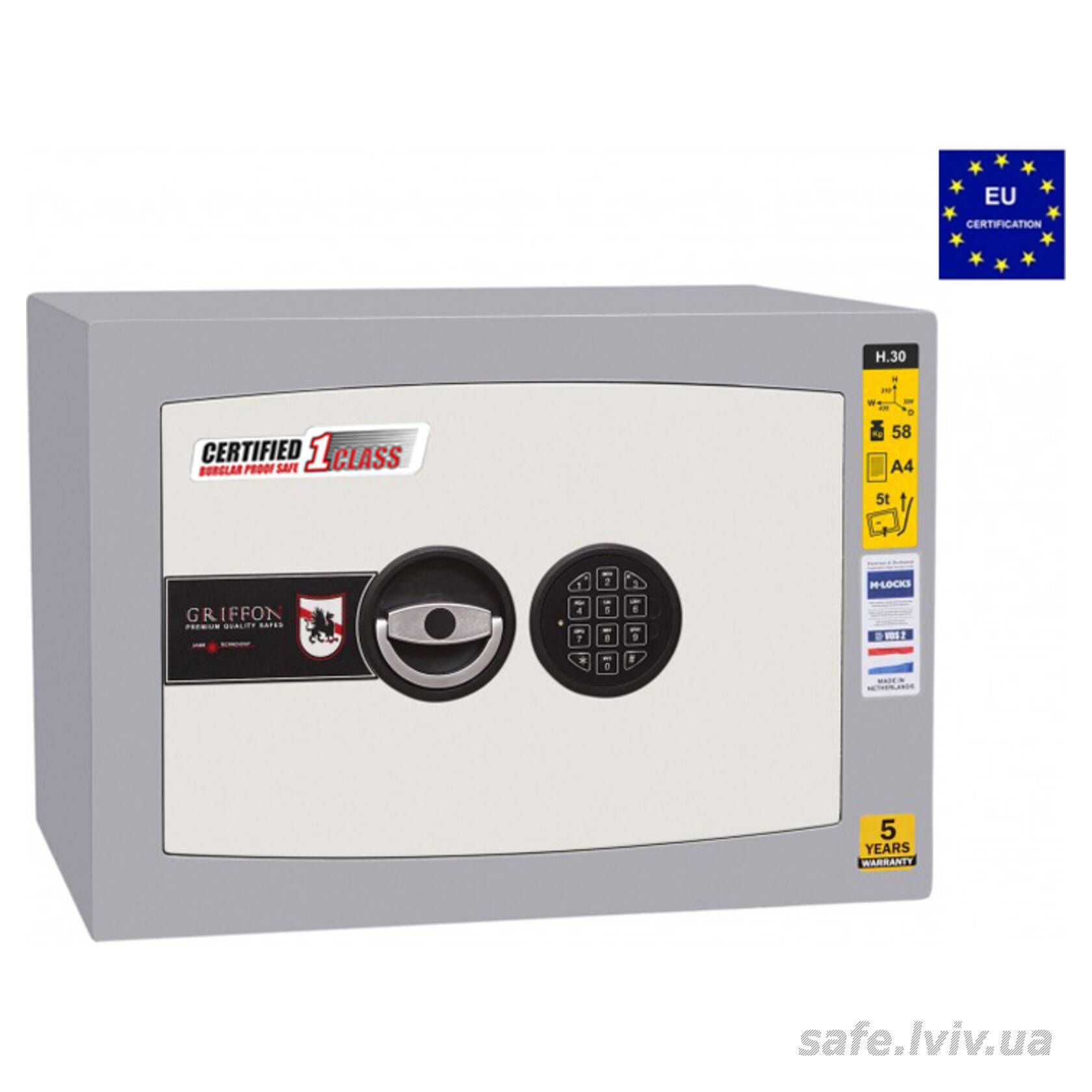 Griffon H.30.E це сертифікований зламостійкий сейф клас I за EN 1143-1 та без вогнестійкості, призначений для зберігання грошей, документів, прикрас і цінностей у домі або офісі. Зламостійкість забезпечує конструкція корпусу 25 мм (сталь - зламостійкий бетон - сталь), дверей 14 мм (сталь), ригельна система тристороння, 4 ригелі Ø 25 мм та замок електронний M-LOCKS (Нідерланди) VdS Class 2 (B). Рекомендовані ліміти зберігання - до 2000 мінімальних зарплат для особистого користування та до 1000 для комерційного.