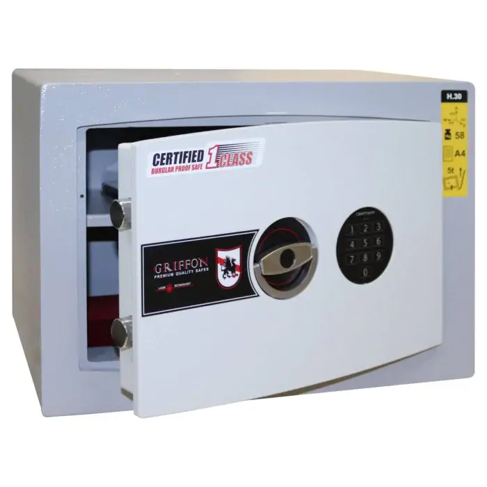 Griffon H.30.E WKP це сертифікований зламостійкий сейф клас I за EN 1143-1 та без вогнестійкості, призначений для зберігання грошей, документів, прикрас і цінностей у домі або офісі. Зламостійкість забезпечує конструкція корпусу 25 мм (сталь - зламостійкий бетон - сталь), дверей 14 мм (сталь), ригельна система тристороння, 4 ригелі Ø 25 мм та замок електронний Carl Wittkopp (Німеччина) VdS Class 2 (B). Рекомендовані ліміти зберігання - до 2000 мінімальних зарплат для особистого користування та до 1000 для комерційного.