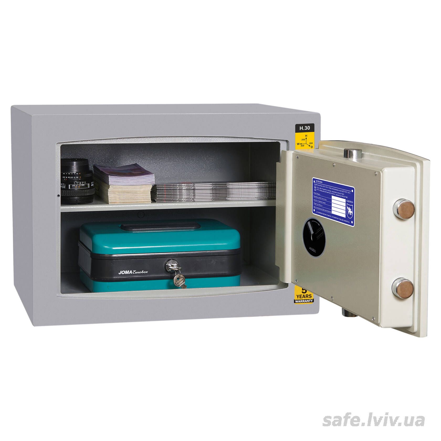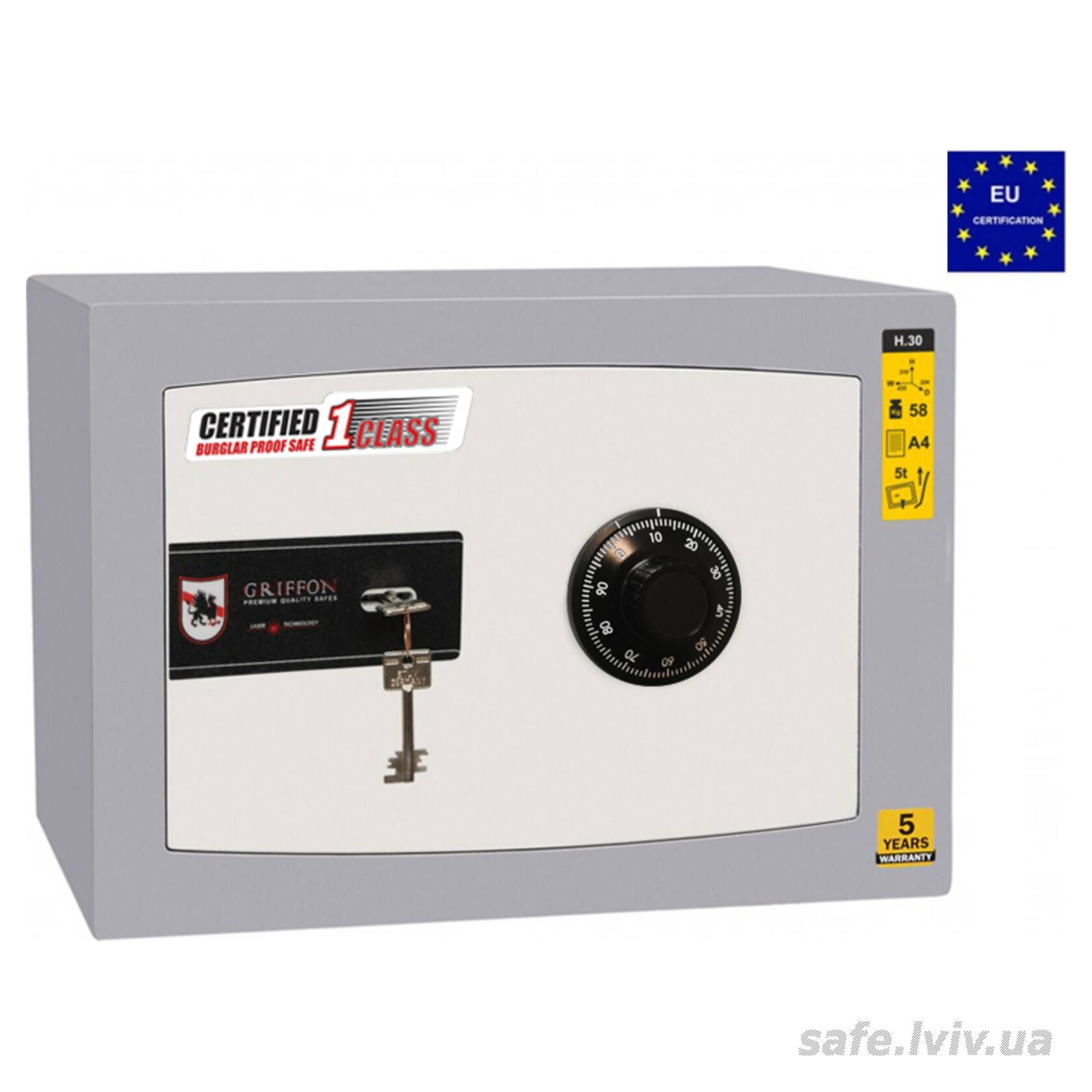 Griffon H.30.K.C це сертифікований зламостійкий сейф клас I за EN 1143-1 та без вогнестійкості, призначений для зберігання грошей, документів, прикрас і цінностей у домі або офісі. Зламостійкість забезпечує конструкція корпусу 25 мм (сталь - зламостійкий бетон - сталь), дверей 14 мм (сталь), ригельна система тристороння, 4 ригелі Ø 25 мм та замок ключовий STUV (Німеччина) VdS Class 1 (A), кодовий механічний La GARD (США) VdS Class 1 (A). Рекомендовані ліміти зберігання - до 2000 мінімальних зарплат для особистого користування та до 1000 для комерційного.