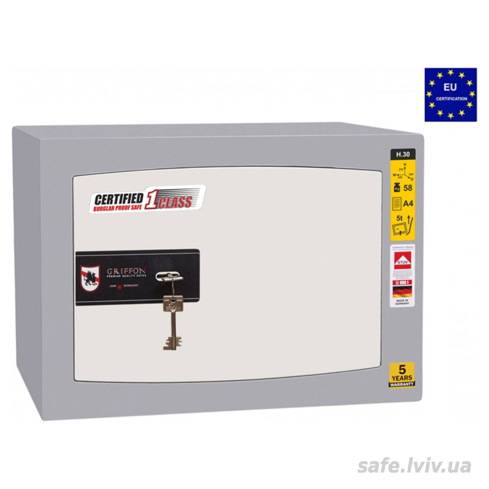 Griffon H.30.K.T це сертифікований зламостійкий сейф клас I за EN 1143-1 та без вогнестійкості, призначений для зберігання грошей, документів, прикрас і цінностей у домі або офісі. Зламостійкість забезпечує конструкція корпусу 25 мм (сталь - зламостійкий бетон - сталь), дверей 14 мм (сталь), ригельна система тристороння, 4 ригелі Ø 25 мм та замок ключовий STUV (Німеччина) VdS Class 1 (A). Рекомендовані ліміти зберігання - до 2000 мінімальних зарплат для особистого користування та до 1000 для комерційного.