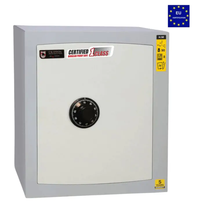 Griffon H.50.C це сертифікований зламостійкий сейф клас I за EN 1143-1 та без вогнестійкості, призначений для зберігання грошей, документів, прикрас і цінностей у домі або офісі. Зламостійкість забезпечує конструкція корпусу 25 мм (сталь - зламостійкий бетон - сталь), дверей 14 мм (сталь), ригельна система тристороння, 4 ригелі Ø 25 мм та замок кодовий механічний La GARD (США) VdS Class 1 (A). Рекомендовані ліміти зберігання - до 2000 мінімальних зарплат для особистого користування та до 1000 для комерційного.
