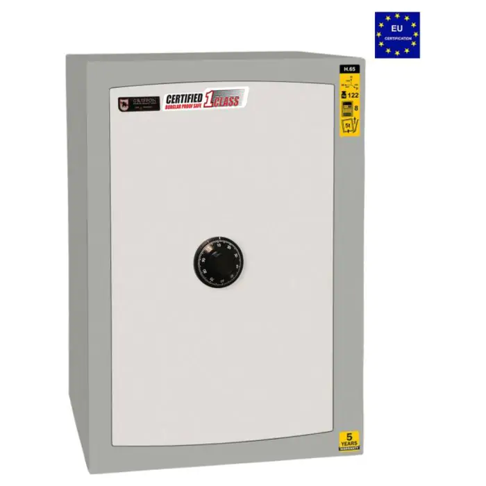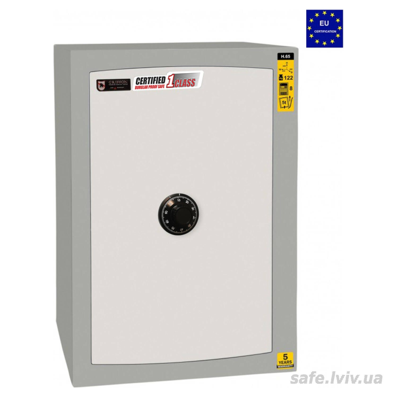 Griffon H.65.C це сертифікований зламостійкий сейф клас I за EN 1143-1 та без вогнестійкості, призначений для зберігання грошей, документів, прикрас і цінностей у домі або офісі. Зламостійкість забезпечує конструкція корпусу 25 мм (сталь - зламостійкий бетон - сталь), дверей 14 мм (сталь), ригельна система тристороння, 4 ригелі Ø 25 мм та замок кодовий механічний La GARD (США) VdS Class 1 (A). Рекомендовані ліміти зберігання - до 2000 мінімальних зарплат для особистого користування та до 1000 для комерційного.