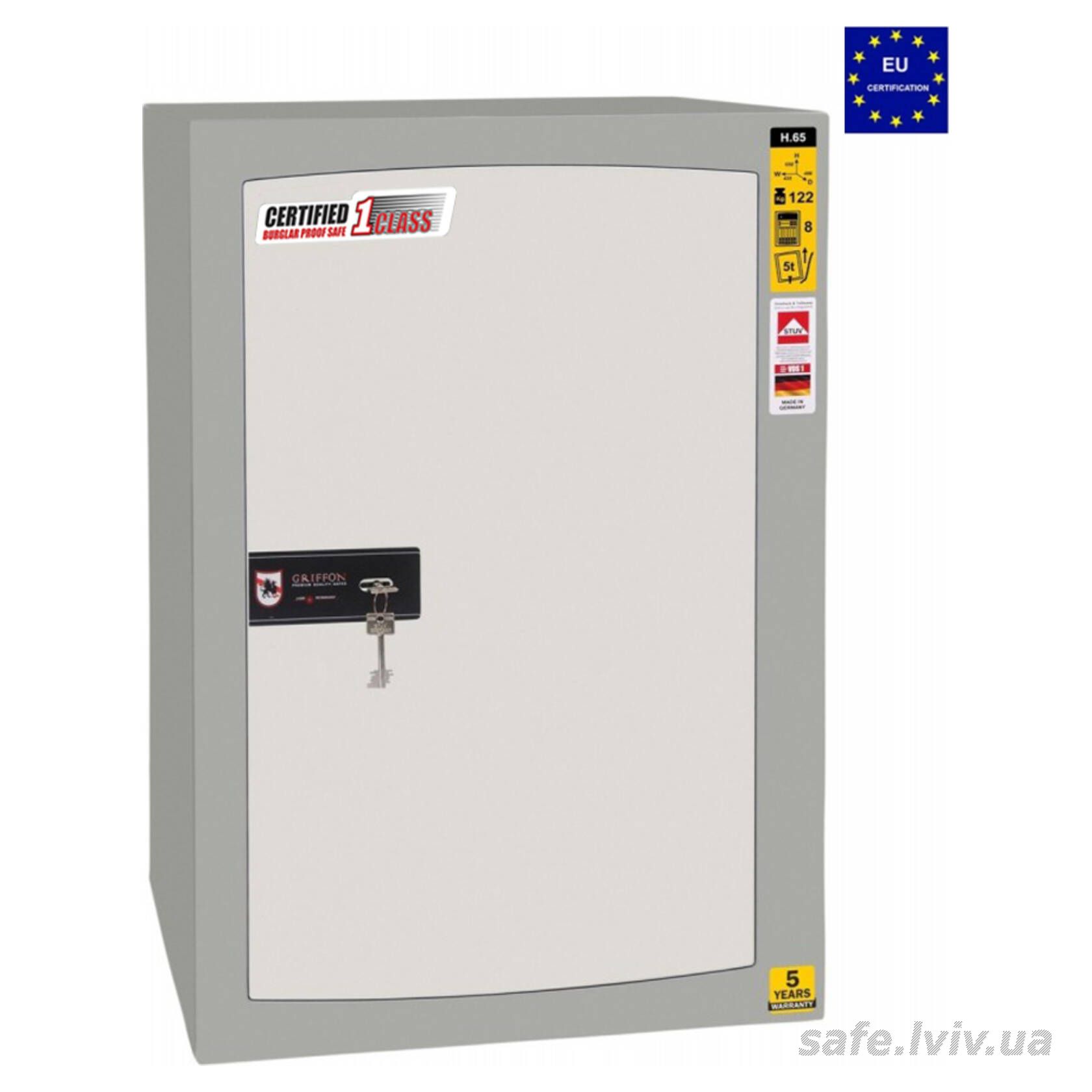 Griffon H.65.K це сертифікований зламостійкий сейф клас I за EN 1143-1 та без вогнестійкості, призначений для зберігання грошей, документів, прикрас і цінностей у домі або офісі. Зламостійкість забезпечує конструкція корпусу 25 мм (сталь - зламостійкий бетон - сталь), дверей 14 мм (сталь), ригельна система тристороння, 4 ригелі Ø 25 мм та замок ключовий STUV (Німеччина) VdS Class 1 (A). Рекомендовані ліміти зберігання - до 2000 мінімальних зарплат для особистого користування та до 1000 для комерційного.