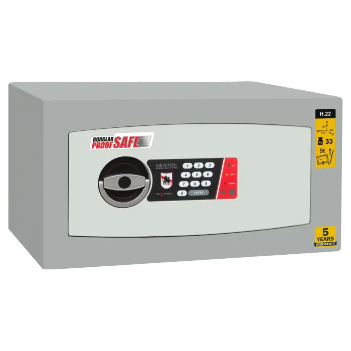 Griffon HG.22.E це сертифікований сейф клас 0 за EN 1143-1 та без вогнестійкості, призначений для надійного зберігання грошей, коштовностей і документів у домі та офісі. Зламостійкість забезпечує конструкція корпусу 25 мм (сталь - зламостійкий бетон - сталь), дверей 14 мм (сталь), ригельна система одностороння, 2 ригелі Ø 25 мм та замок - електронний Griffon 2.0 (Україна). Рекомендовані ліміти зберігання - до 800 мінімальних зарплат.