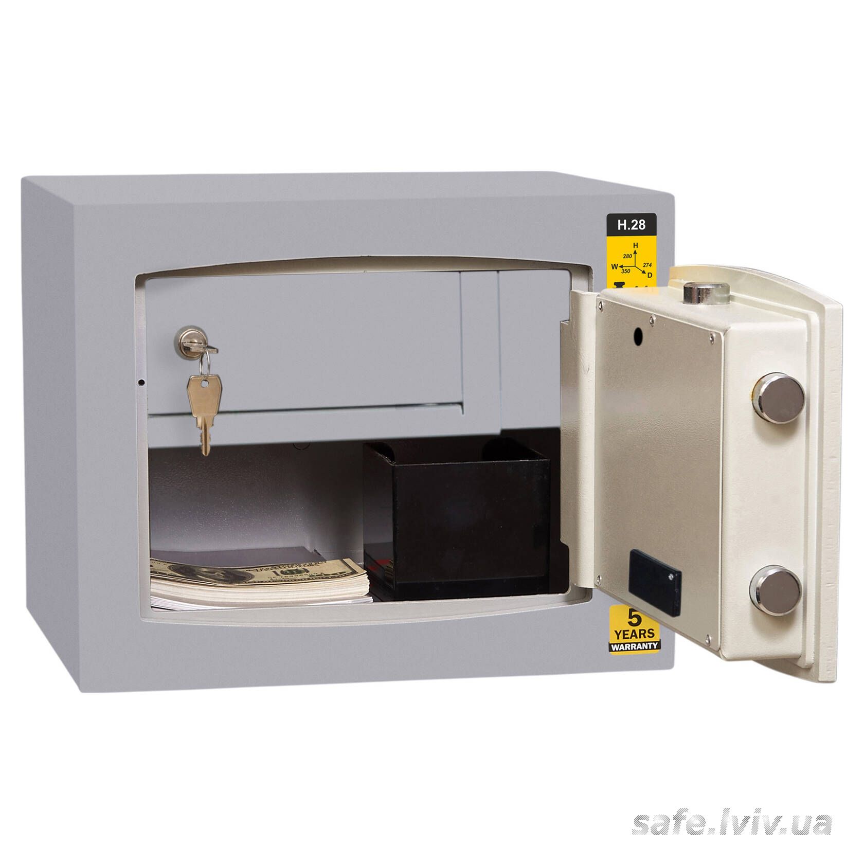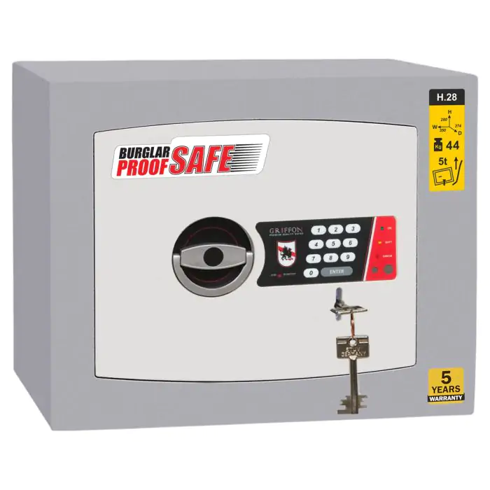 Griffon HG.28.K.E.T це сертифікований сейф клас 0 за EN 1143-1 та без вогнестійкості, призначений для надійного зберігання грошей, коштовностей і документів у домі та офісі. Зламостійкість забезпечує конструкція корпусу 25 мм (сталь - зламостійкий бетон - сталь), дверей 14 мм (сталь), ригельна система одностороння, 2 ригелі Ø 25 мм та замок - електронний Griffon 2.0 (Україна), ключовий STUV (Німеччина) VdS Class 1 (A). Рекомендовані ліміти зберігання - до 800 мінімальних зарплат.