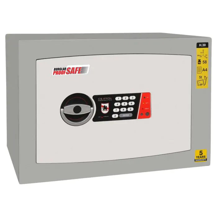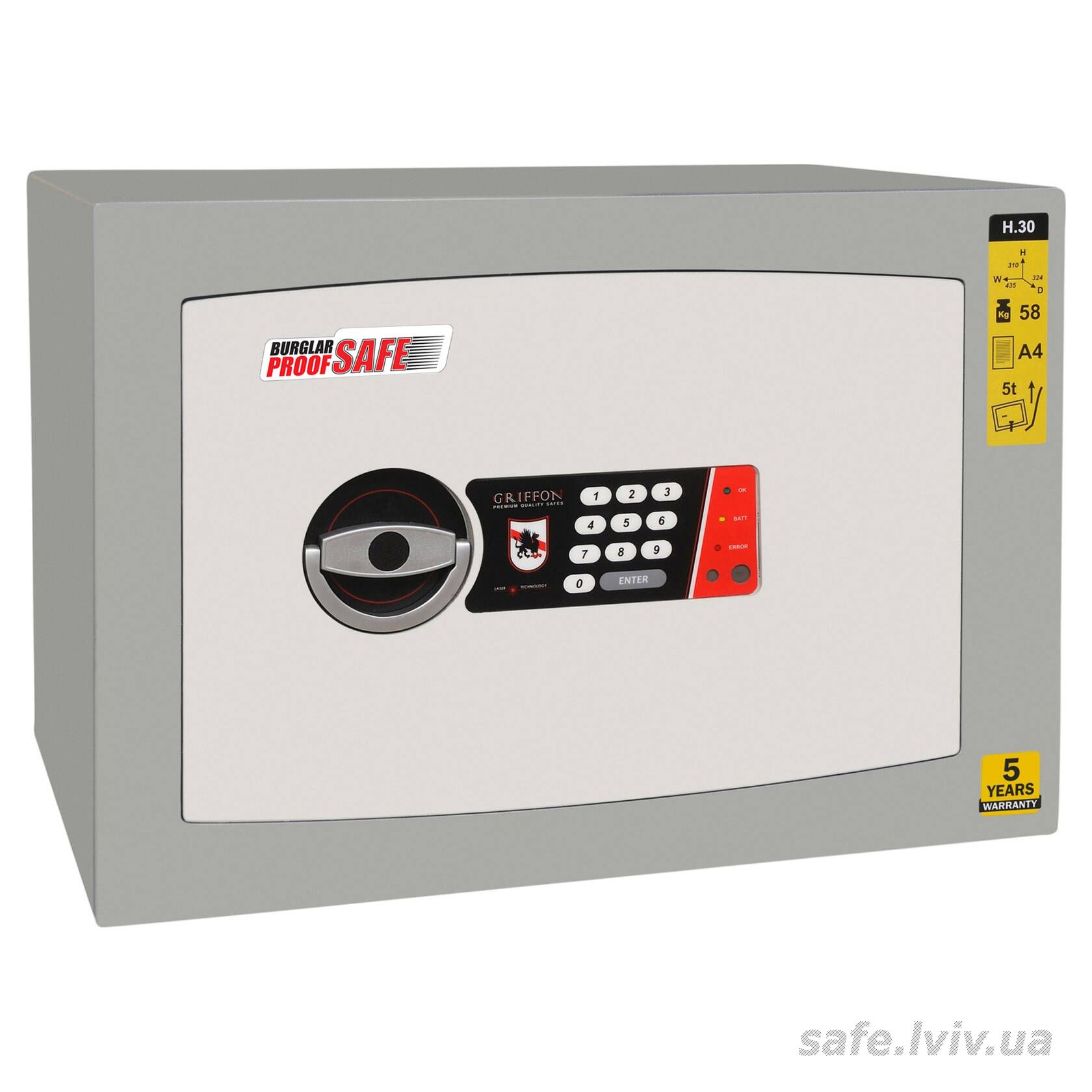 Griffon HG.30.E це сертифікований сейф клас 0 за EN 1143-1 та без вогнестійкості, призначений для надійного зберігання грошей, коштовностей і документів у домі та офісі. Зламостійкість забезпечує конструкція корпусу 25 мм (сталь - зламостійкий бетон - сталь), дверей 14 мм (сталь), ригельна система одностороння, 2 ригелі Ø 25 мм та замок - електронний Griffon 2.0 (Україна). Рекомендовані ліміти зберігання - до 800 мінімальних зарплат.