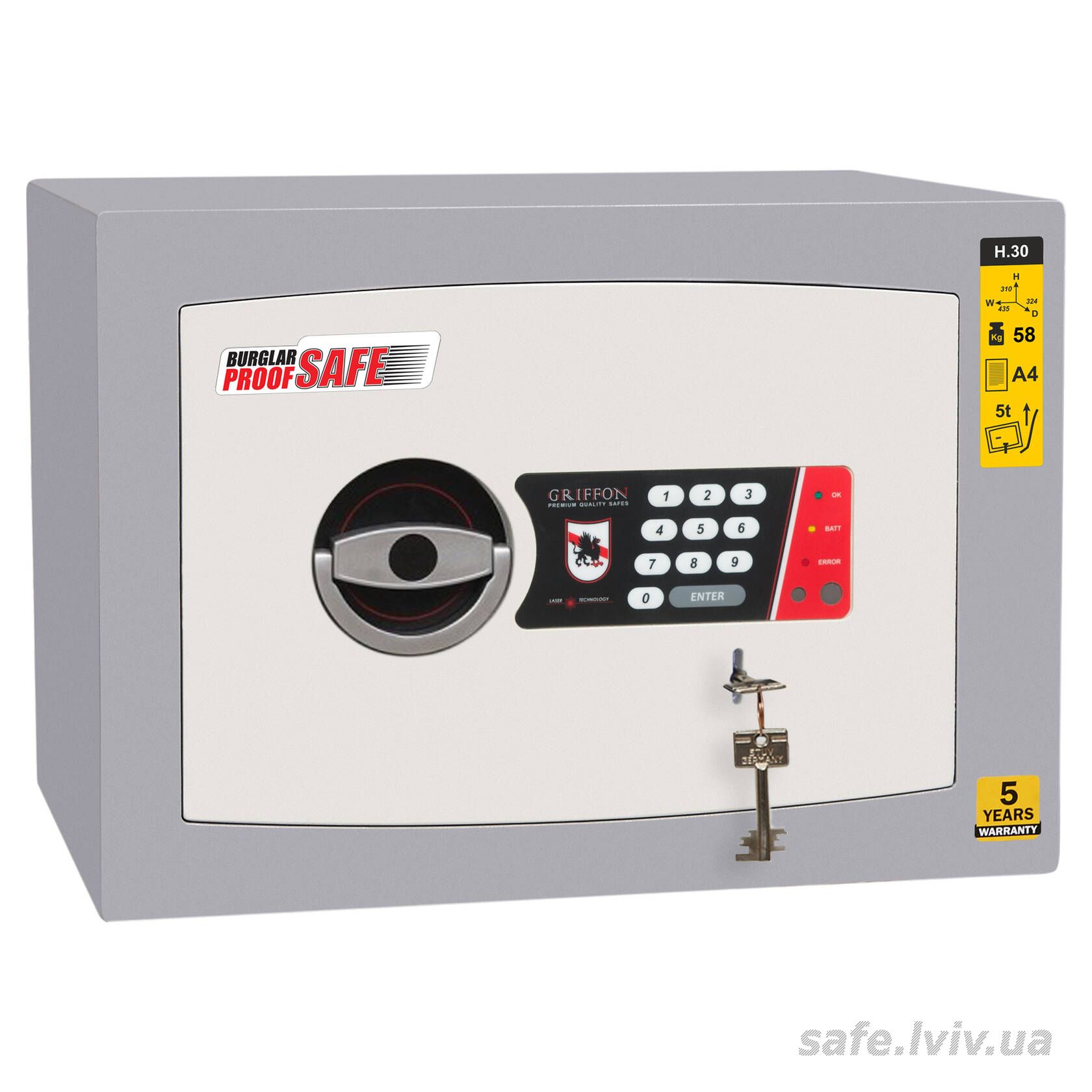 Griffon HG.30.K.E.T це сертифікований сейф клас 0 за EN 1143-1 та без вогнестійкості, призначений для надійного зберігання грошей, коштовностей і документів у домі та офісі. Зламостійкість забезпечує конструкція корпусу 25 мм (сталь - зламостійкий бетон - сталь), дверей 14 мм (сталь), ригельна система одностороння, 2 ригелі Ø 25 мм та замок - електронний Griffon 2.0 (Україна), ключовий STUV (Німеччина) VdS Class 1 (A). Рекомендовані ліміти зберігання - до 800 мінімальних зарплат.
