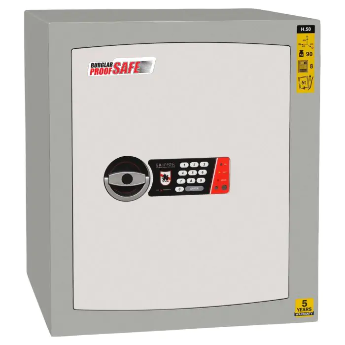 Griffon HG.50.E це сертифікований сейф клас 0 за EN 1143-1 та без вогнестійкості, призначений для надійного зберігання грошей, коштовностей і документів у домі та офісі. Зламостійкість забезпечує конструкція корпусу 25 мм (сталь - зламостійкий бетон - сталь), дверей 14 мм (сталь), ригельна система тристороння, 4 ригелі Ø 25 мм та замок - електронний Griffon 2.0 (Україна). Рекомендовані ліміти зберігання - до 800 мінімальних зарплат.