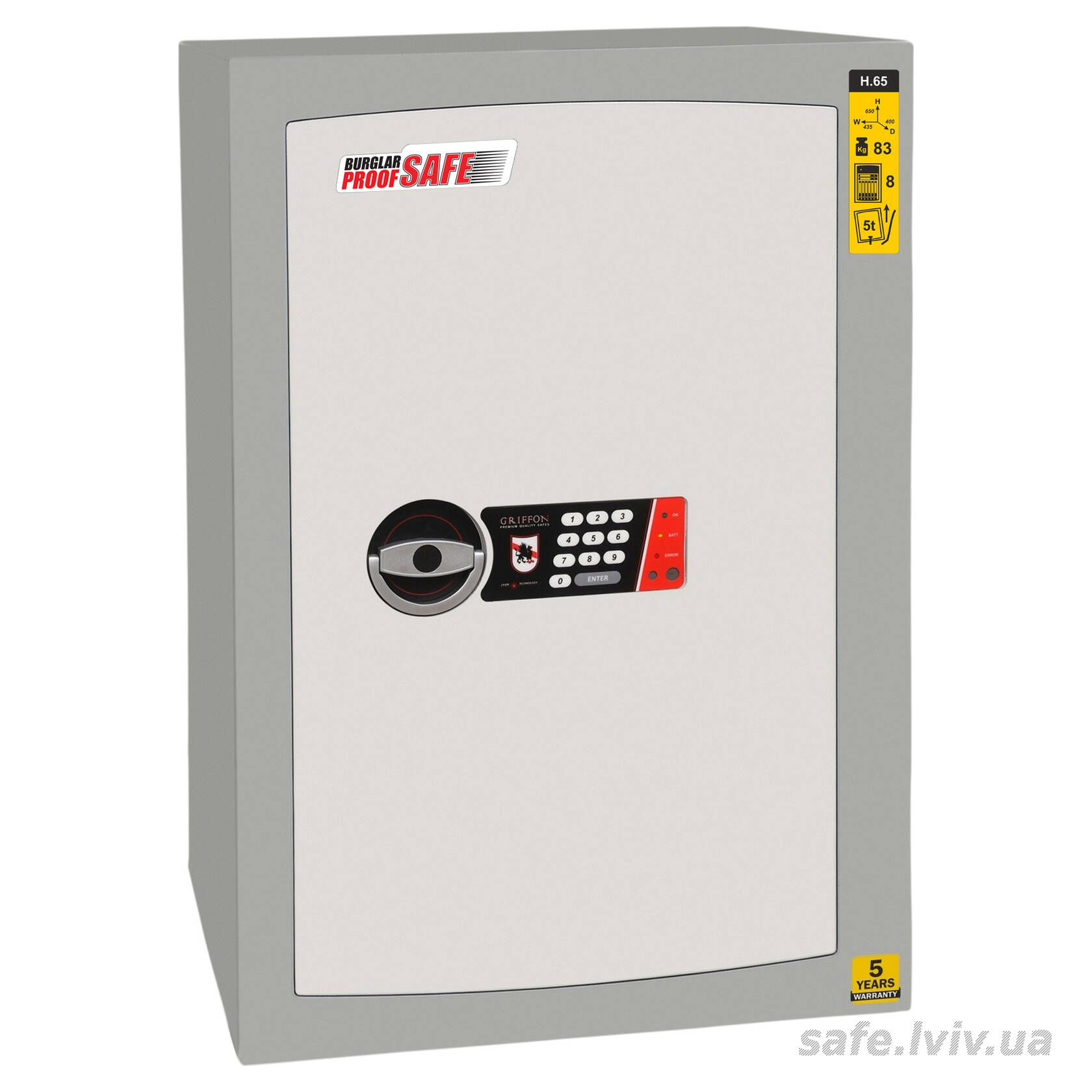 Griffon HG.65.E це сертифікований сейф клас 0 за EN 1143-1 та без вогнестійкості, призначений для надійного зберігання грошей, коштовностей і документів у домі та офісі. Зламостійкість забезпечує конструкція корпусу 25 мм (сталь - зламостійкий бетон - сталь), дверей 14 мм (сталь), ригельна система тристороння, 4 ригелі Ø 25 мм та замок - електронний Griffon 2.0 (Україна). Рекомендовані ліміти зберігання - до 800 мінімальних зарплат.