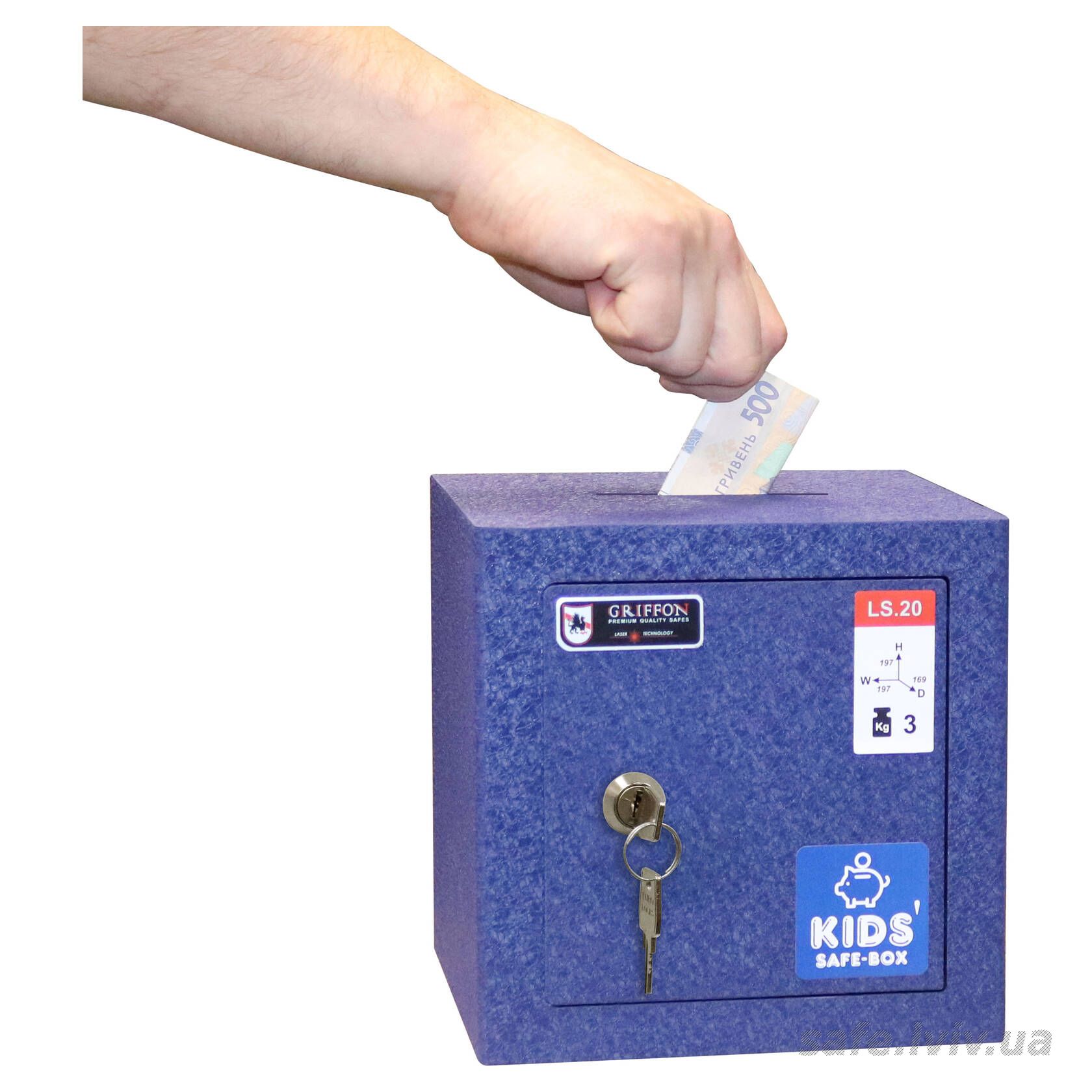 Griffon LS.20.K Blue це сейф сейф дитячий, сейф скарбничка, призначений для зберігання грошей, дрібних цінностей та особистих речей дитини. Компактний і легкий у користуванні. Яскравий колір - темно-синій, сірий RAL 7035. Конструкція зі сталі: корпус 1.5 мм (сталь), двері 1.5 мм (сталь). Двері оснащені замком - ключовий EUROLOCKS (Польща). Усередині - .