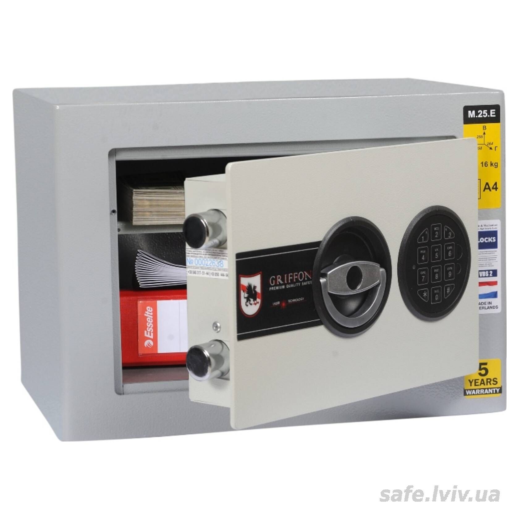 Griffon M.25.E · Сейф меблевий для дому класу опору S1 - це сейф зі зламостійкістю клас S1 за EN 14450, призначений для надійного зберігання таких речей, як документи А5, а також грошей до 800 тис грн. Зламостійкість забезпечує конструкція корпусу 4 мм (сталь), дверей 4 мм (сталь), ригельна система одностороння, 2 ригелі Ø 25 мм та замок - електронний M-LOCKS (Нідерланди) VdS Class 2 (B).