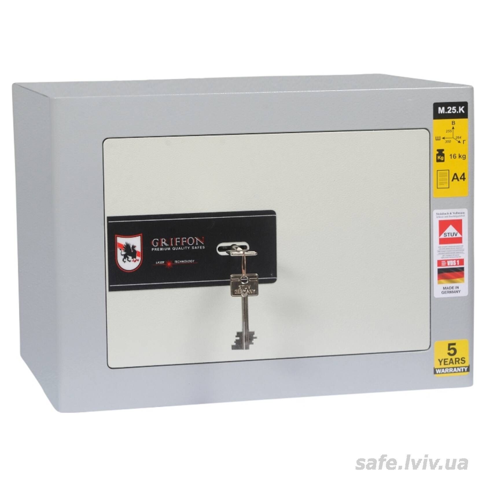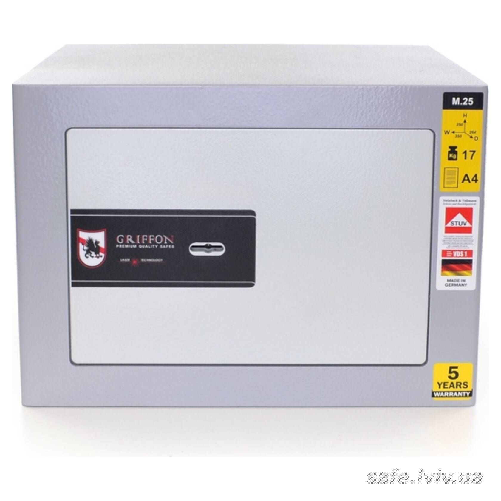 Griffon M.25.K · Сейф меблевий для дому класу опору S1 - це сейф зі зламостійкістю клас S1 за EN 14450, призначений для надійного зберігання таких речей, як документи А5, а також грошей до 800 тис грн. Зламостійкість забезпечує конструкція корпусу 4 мм (сталь), дверей 4 мм (сталь), ригельна система одностороння, 2 ригелі Ø 25 мм та замок - ключовий STUV (Німеччина) VdS Class 1 (A).