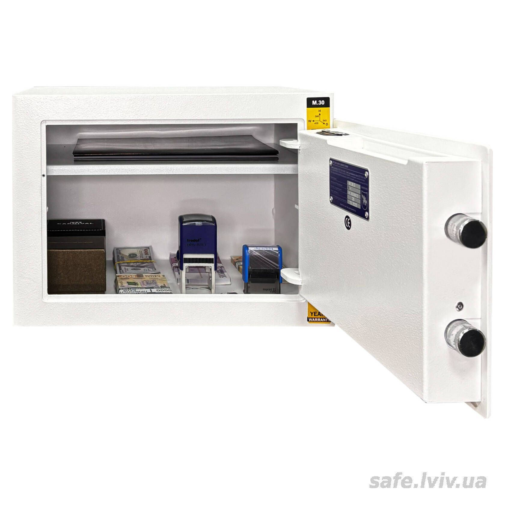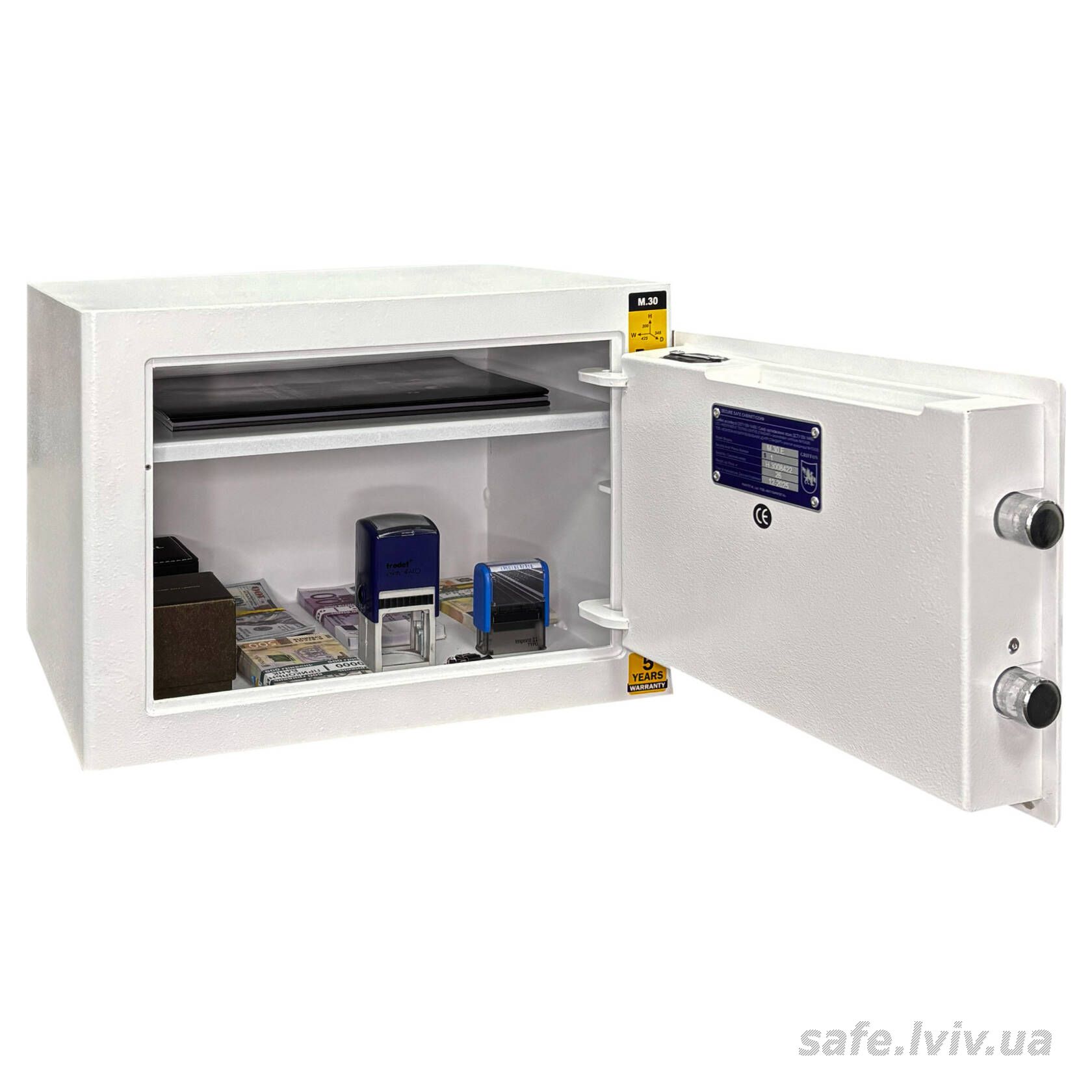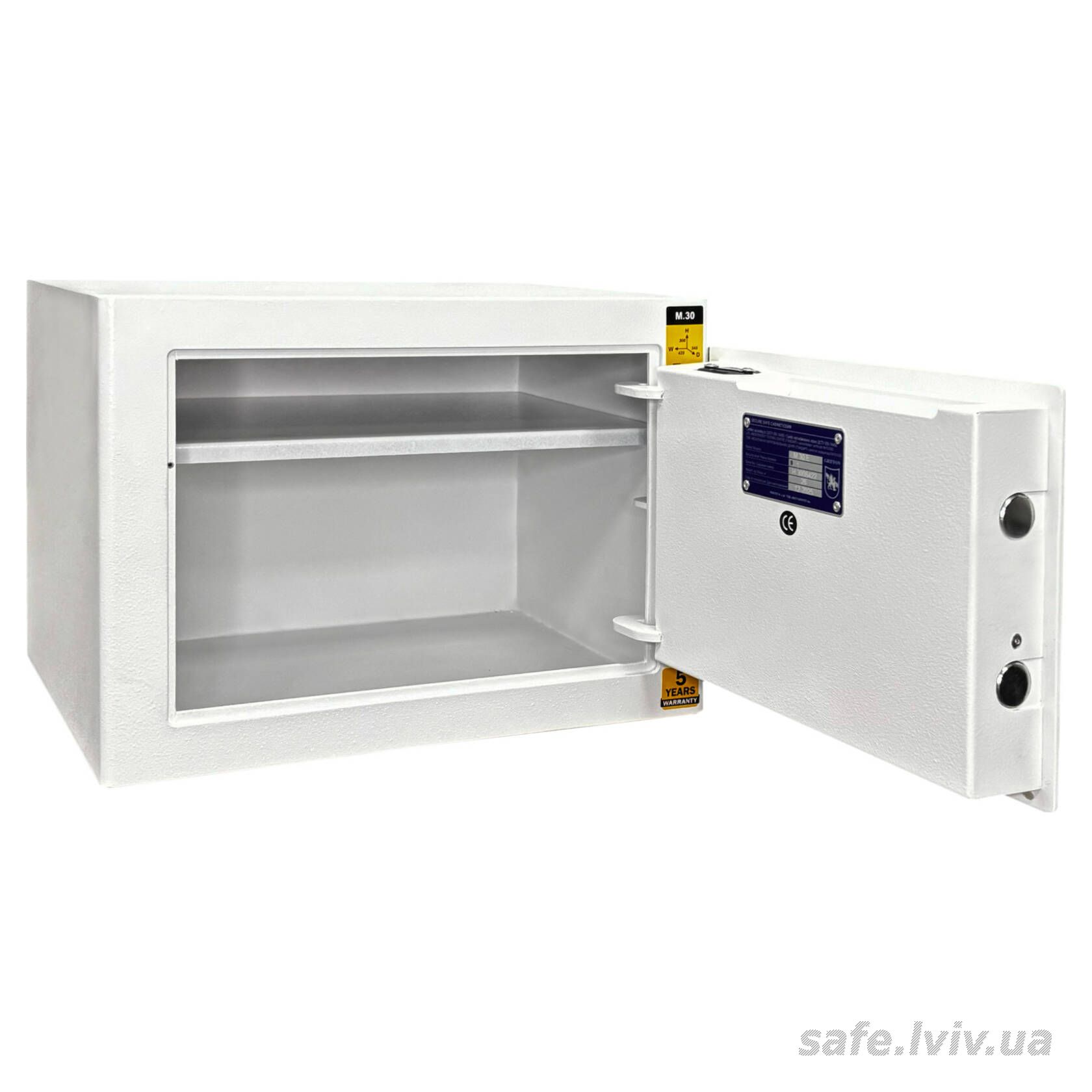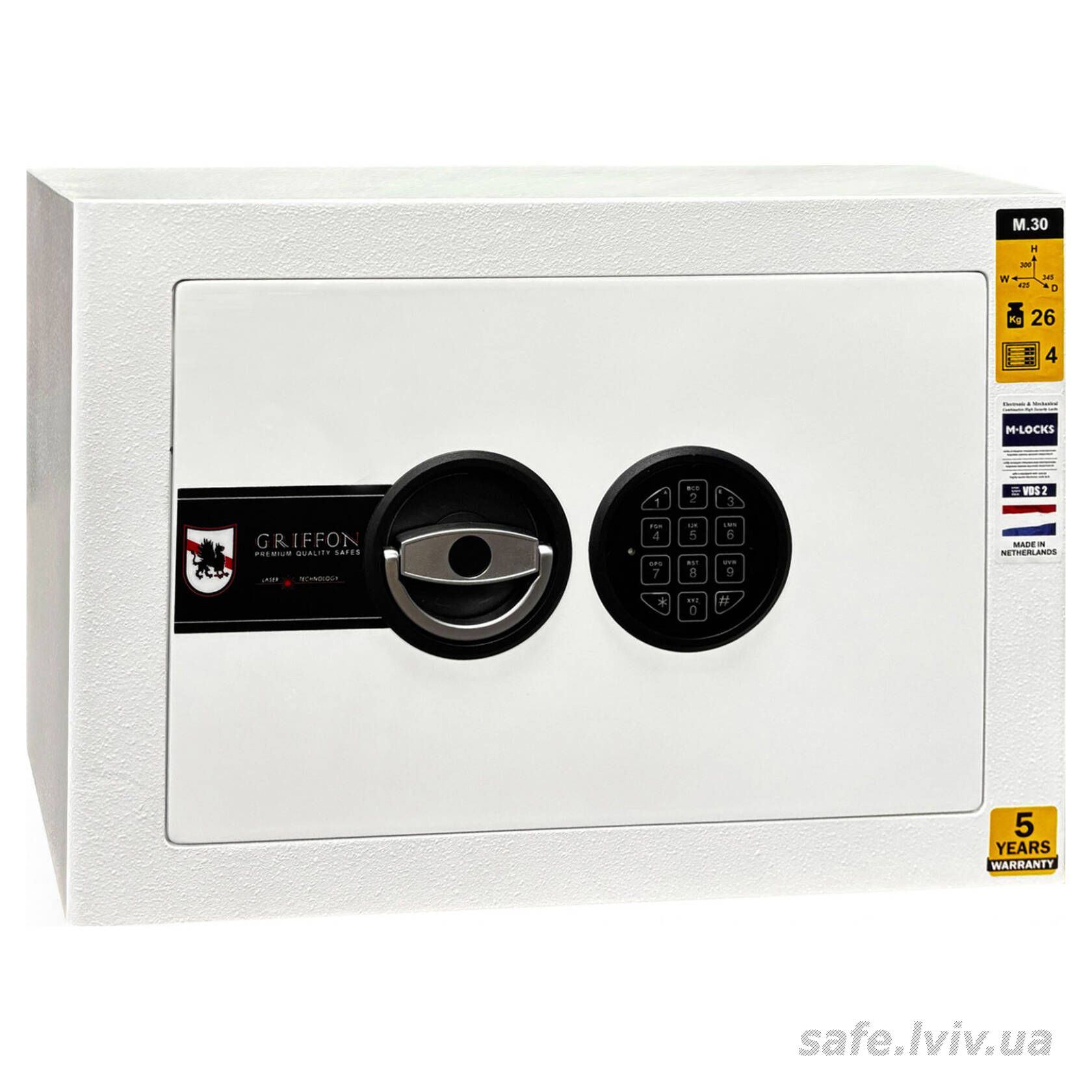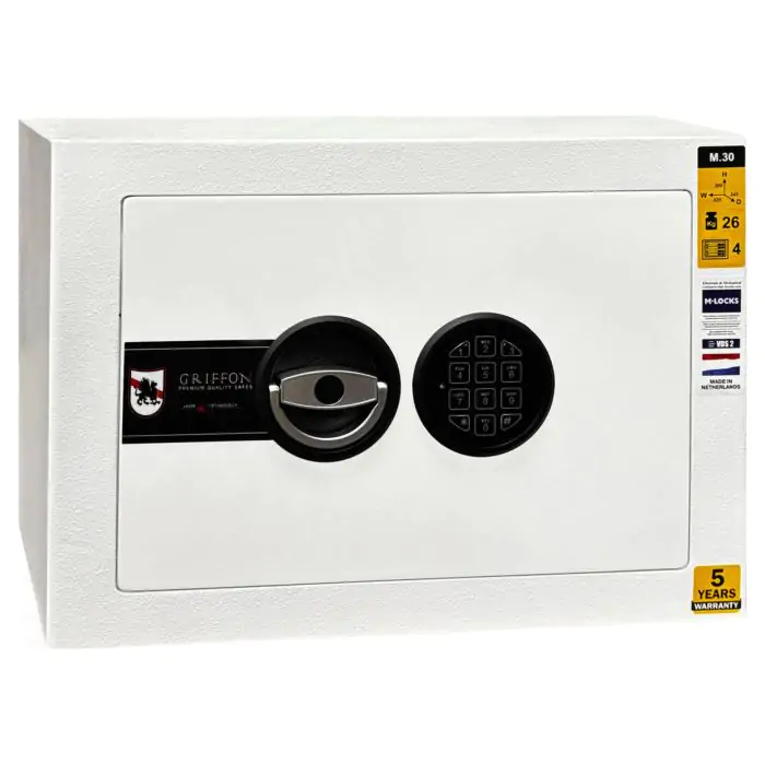 Griffon M.30.E WHITE GLOSS · Сейф меблевий для дому класу опору S1 - це сейф зі зламостійкістю клас S1 за EN 14450, призначений для надійного зберігання таких речей, як документи А4, ноутбук, папки А4, а також грошей до 800 тис грн. Зламостійкість забезпечує конструкція корпусу 4 мм (сталь), дверей 4 мм (сталь), ригельна система одностороння, 2 ригелі Ø 25 мм та замок - електронний M-LOCKS (Нідерланди) VdS Class 2 (B).
