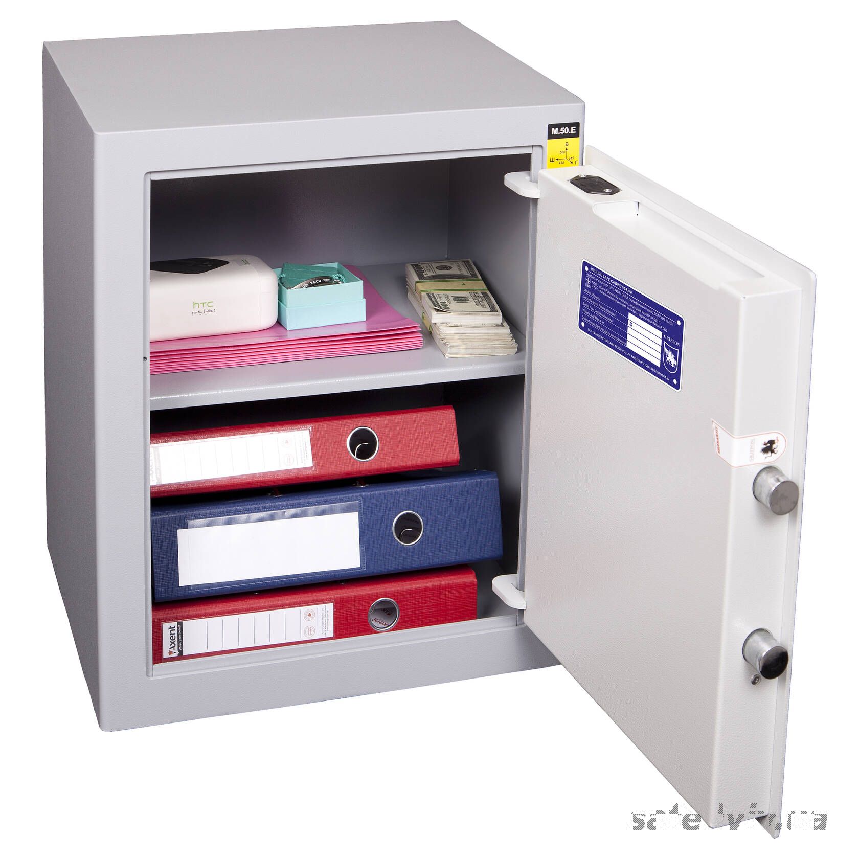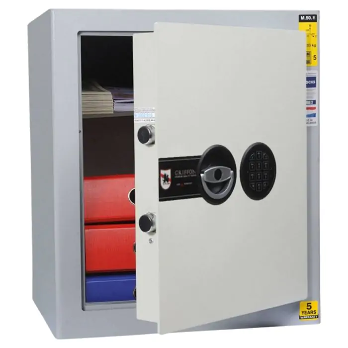 Griffon M.50.E · Сейф офісний для документів класу опору S1 - це сейф зі зламостійкістю клас S1 за EN 14450, призначений для надійного зберігання таких речей, як документи А4, ноутбук, папки А4, а також грошей до 800 тис грн. Зламостійкість забезпечує конструкція корпусу 4 мм (сталь), дверей 4 мм (сталь), ригельна система одностороння, 2 ригелі Ø 25 мм та замок - електронний M-LOCKS (Нідерланди) VdS Class 2 (B).