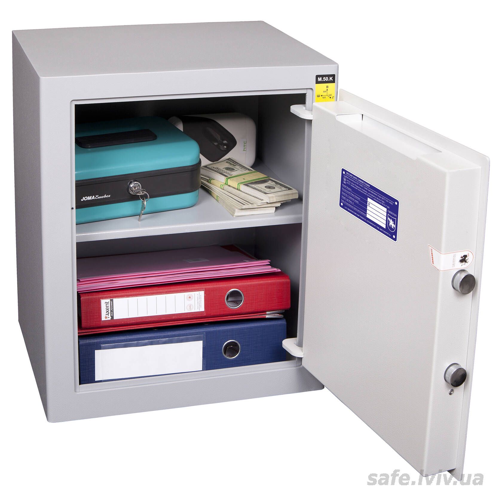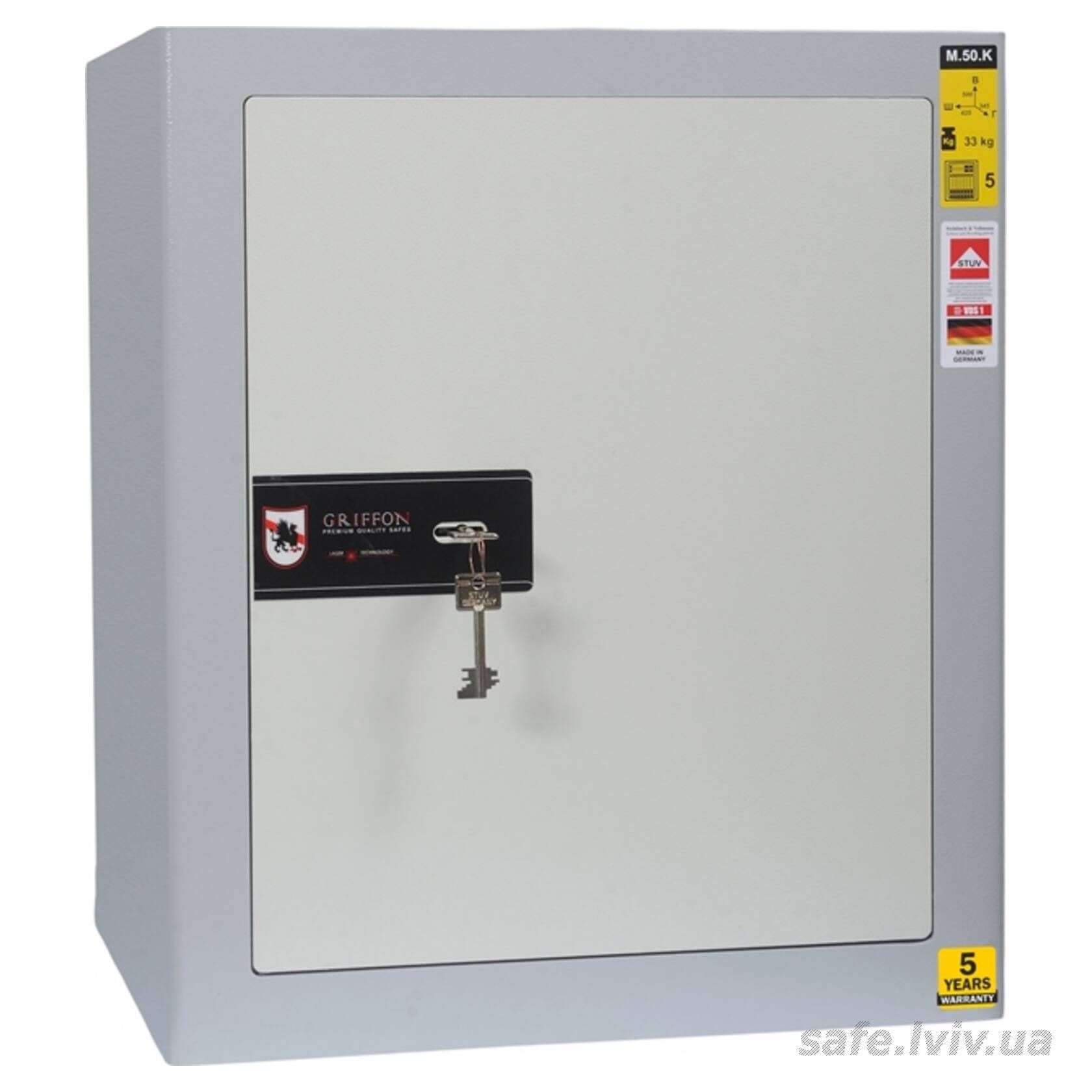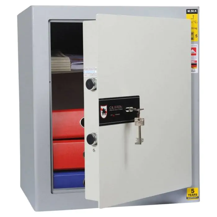 Griffon M.50.K · Сейф офісний для документів класу опору S1 - це сейф зі зламостійкістю клас S1 за EN 14450, призначений для надійного зберігання таких речей, як документи А4, ноутбук, папки А4, а також грошей до 800 тис грн. Зламостійкість забезпечує конструкція корпусу 4 мм (сталь), дверей 4 мм (сталь), ригельна система одностороння, 2 ригелі Ø 25 мм та замок - ключовий STUV (Німеччина) VdS Class 1 (A).