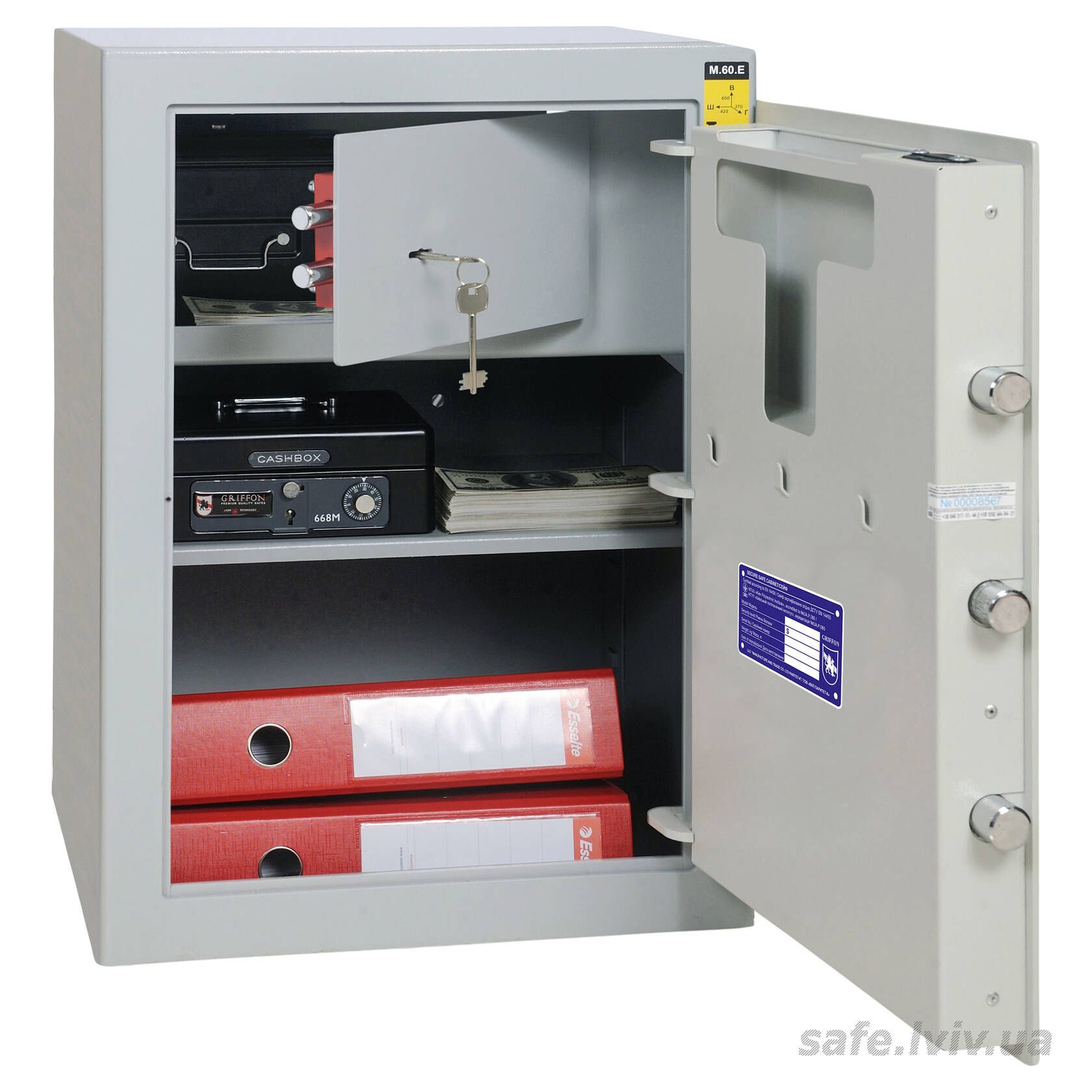 Griffon M.60.E · Сейф офісний для документів класу опору S1 - це сейф зі зламостійкістю клас S1 за EN 14450, призначений для надійного зберігання таких речей, як документи А4, ноутбук, папки А4, а також грошей до 800 тис грн. Зламостійкість забезпечує конструкція корпусу 4 мм (сталь), дверей 4 мм (сталь), ригельна система одностороння, 2 ригелі Ø 25 мм та замок - електронний M-LOCKS (Нідерланди) VdS Class 2 (B).