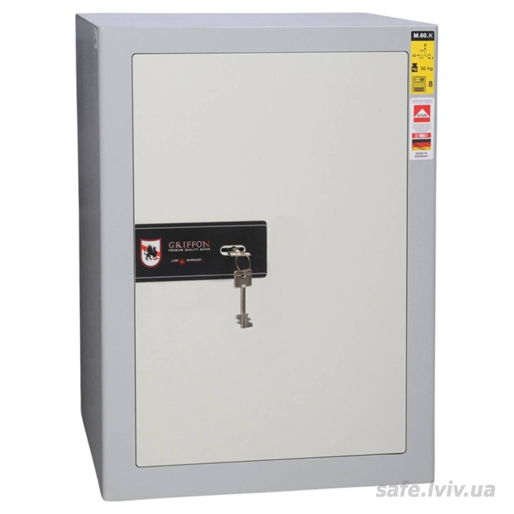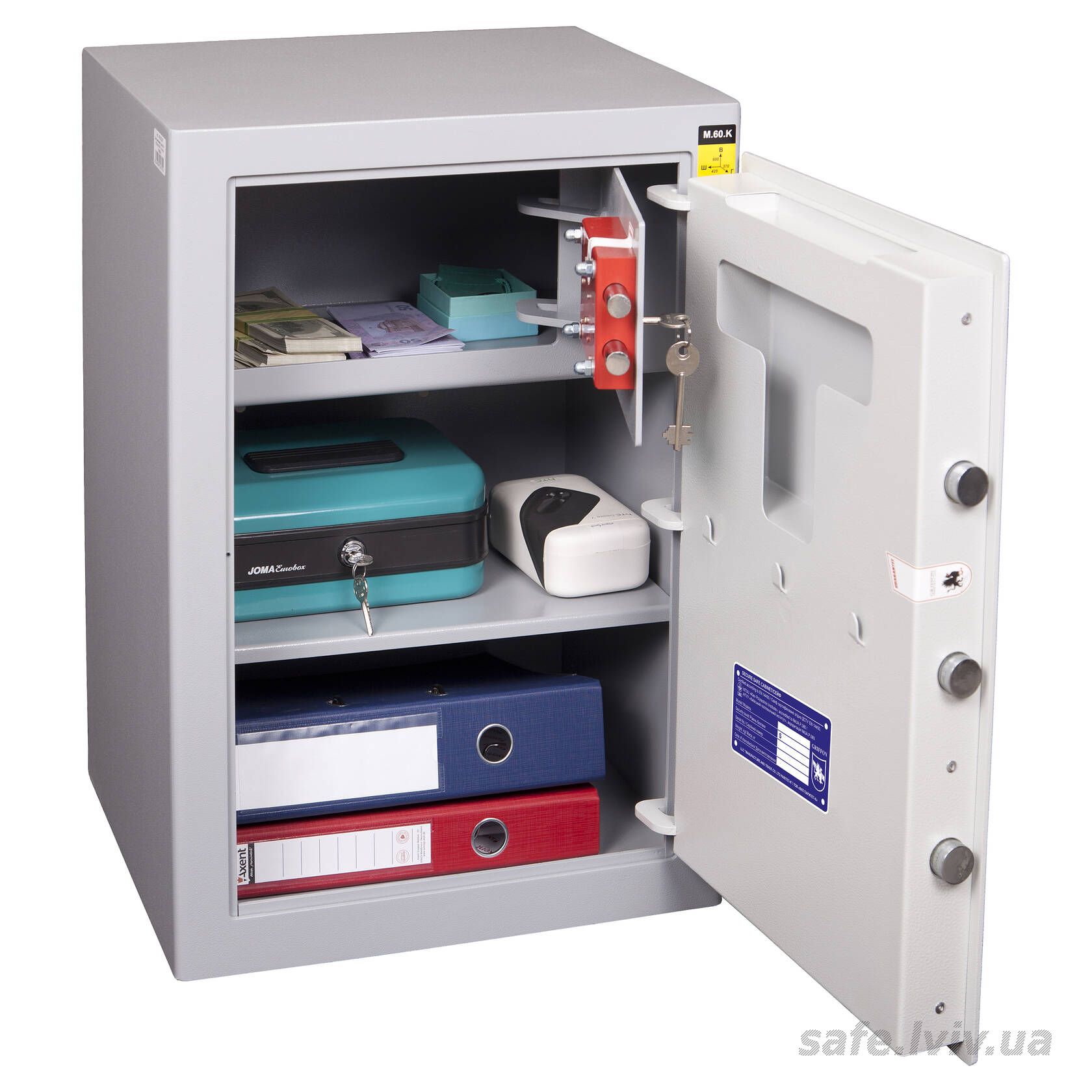 Griffon M.60.K · Сейф офісний для документів класу опору S1 - це сейф зі зламостійкістю клас S1 за EN 14450, призначений для надійного зберігання таких речей, як документи А4, ноутбук, папки А4, а також грошей до 800 тис грн. Зламостійкість забезпечує конструкція корпусу 4 мм (сталь), дверей 4 мм (сталь), ригельна система одностороння, 2 ригелі Ø 25 мм та замок - ключовий STUV (Німеччина) VdS Class 1 (A).