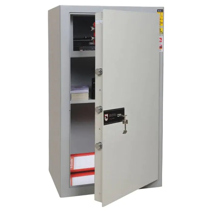 Griffon M.80.K · Сейф офісний для документів класу опору S1 - це сейф зі зламостійкістю клас S1 за EN 14450, призначений для надійного зберігання таких речей, як документи А4, ноутбук, папки А4, а також грошей до 800 тис грн. Зламостійкість забезпечує конструкція корпусу 4 мм (сталь), дверей 4 мм (сталь), ригельна система одностороння, 2 ригелі Ø 25 мм та замок - ключовий STUV (Німеччина) VdS Class 1 (A).