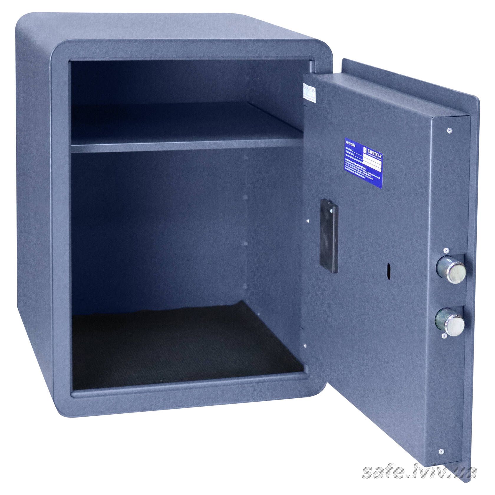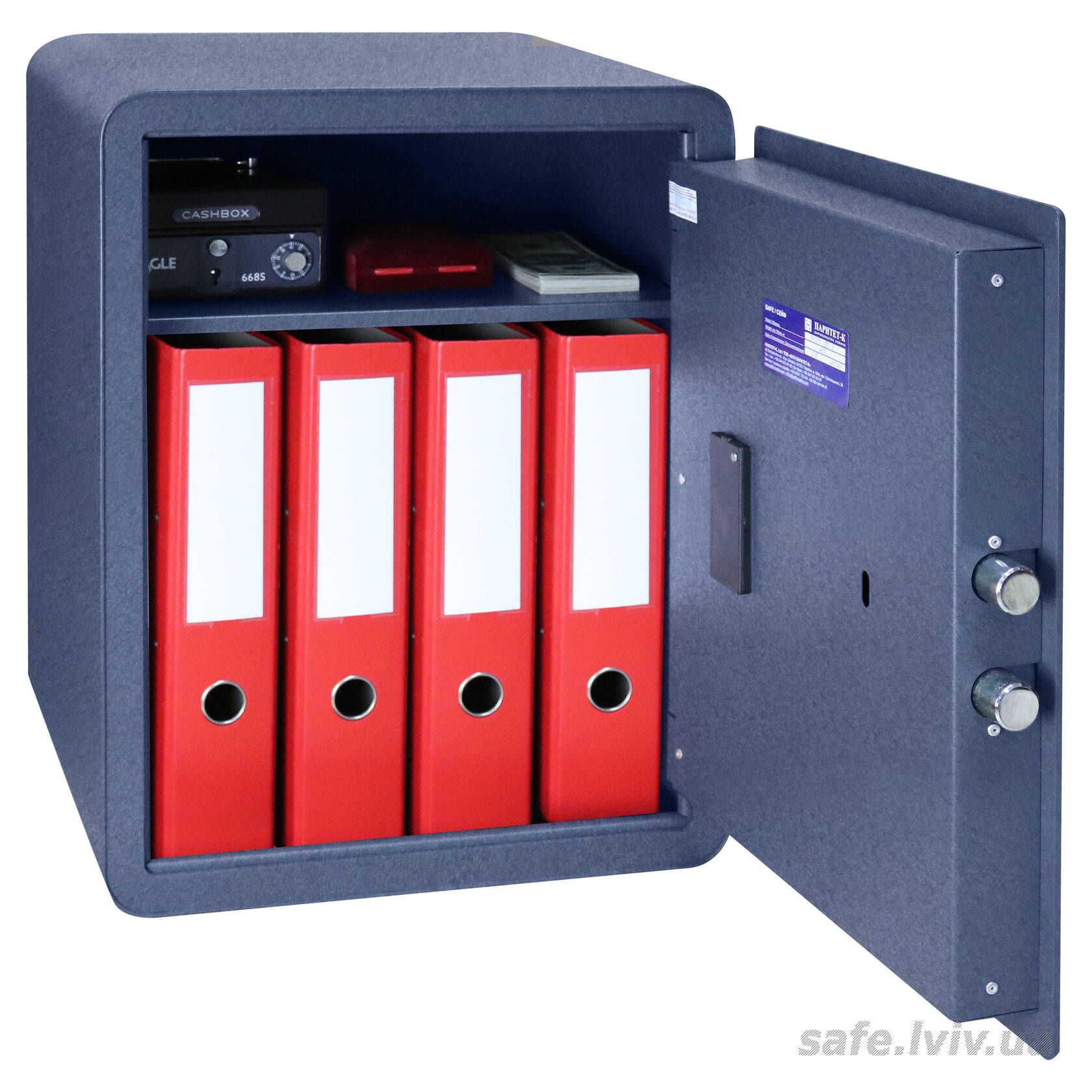 - Конструкція: корпус 2 мм (сталь), двері 4 мм (сталь); ригельна система одностороння, 2 ригелі Ø 25 мм.