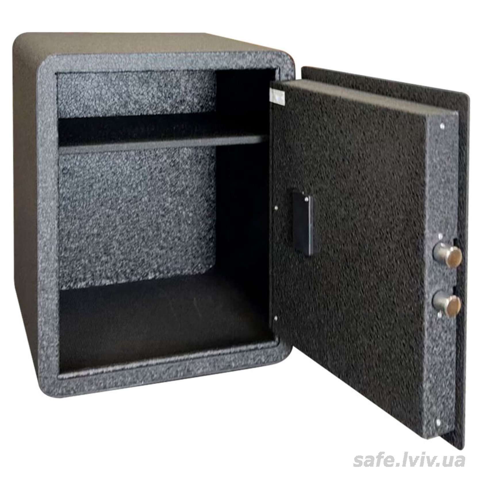 - Конструкція: корпус 2 мм (сталь), двері 4 мм (сталь); ригельна система одностороння, 2 ригелі Ø 25 мм.