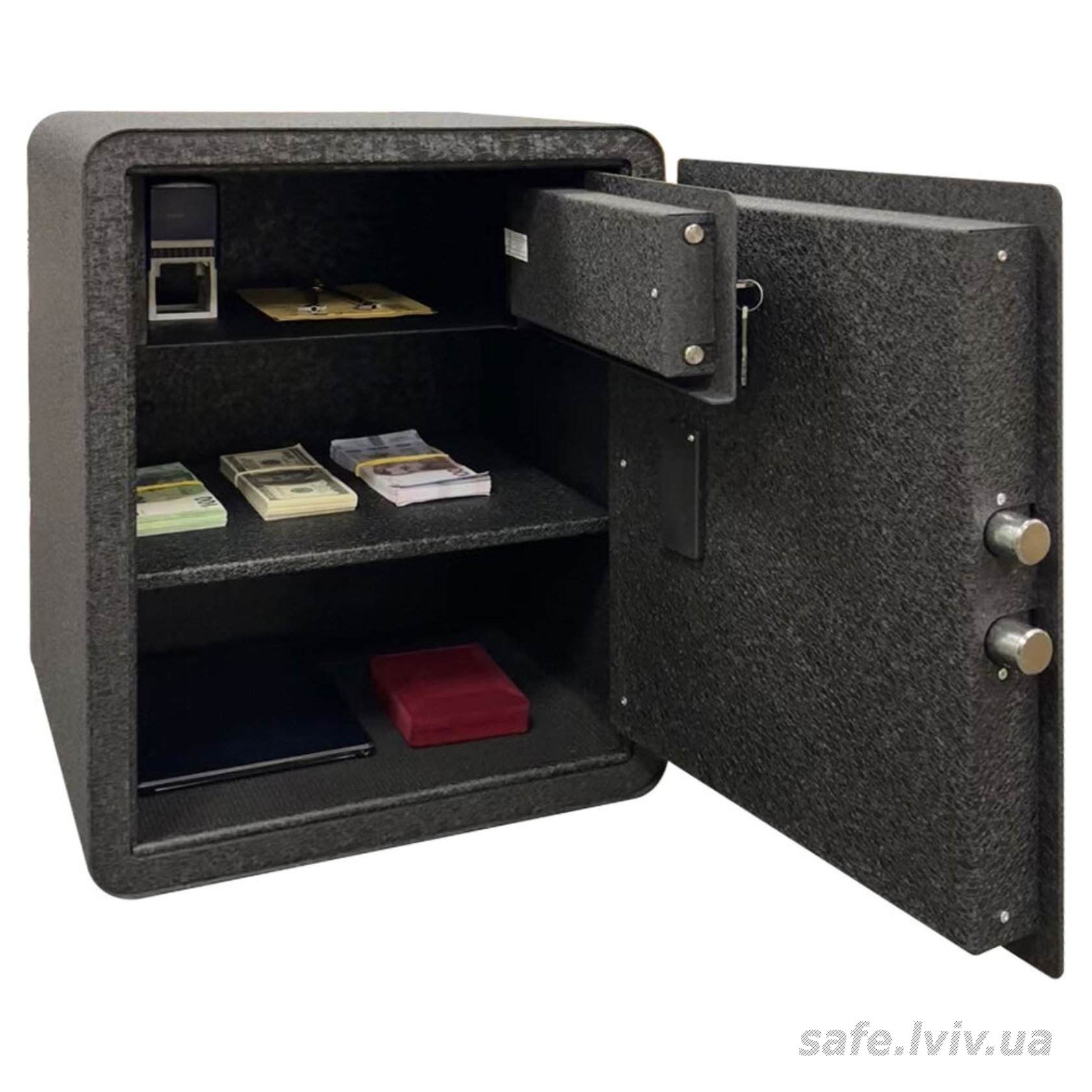 - Конструкція: корпус 2 мм (сталь), двері 4 мм (сталь); ригельна система одностороння, 2 ригелі Ø 25 мм.