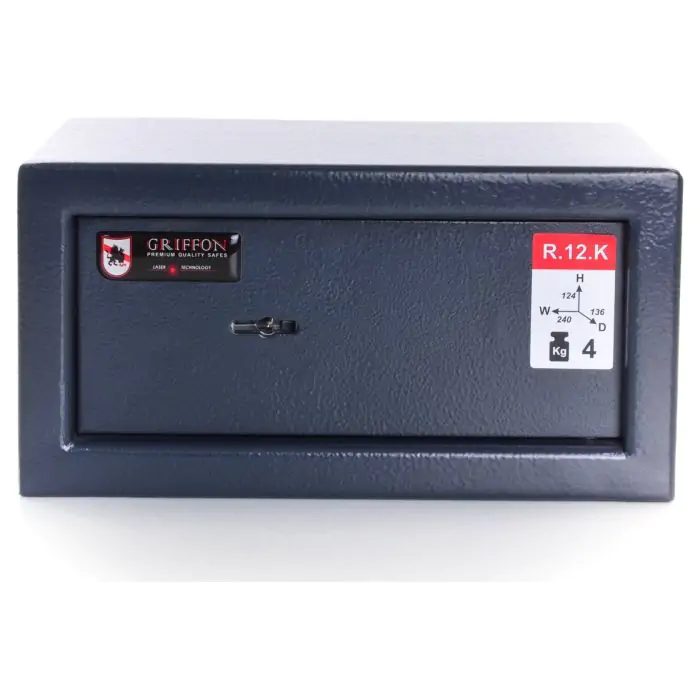 Griffon R.12.K це сейф меблевий, для дому, за допомогою якого можна захистити у квартирі, будинку чи офісі. Конструкція корпусу 2 мм (сталь), дверей 4 мм (сталь), ригельна система та замок - ключовий STUV (Німеччина) VdS Class 1 (A) забезпечують базовий рівень захисту. Сейф вміщає . Передбачена можливість анкерування до підлоги чи стіни.