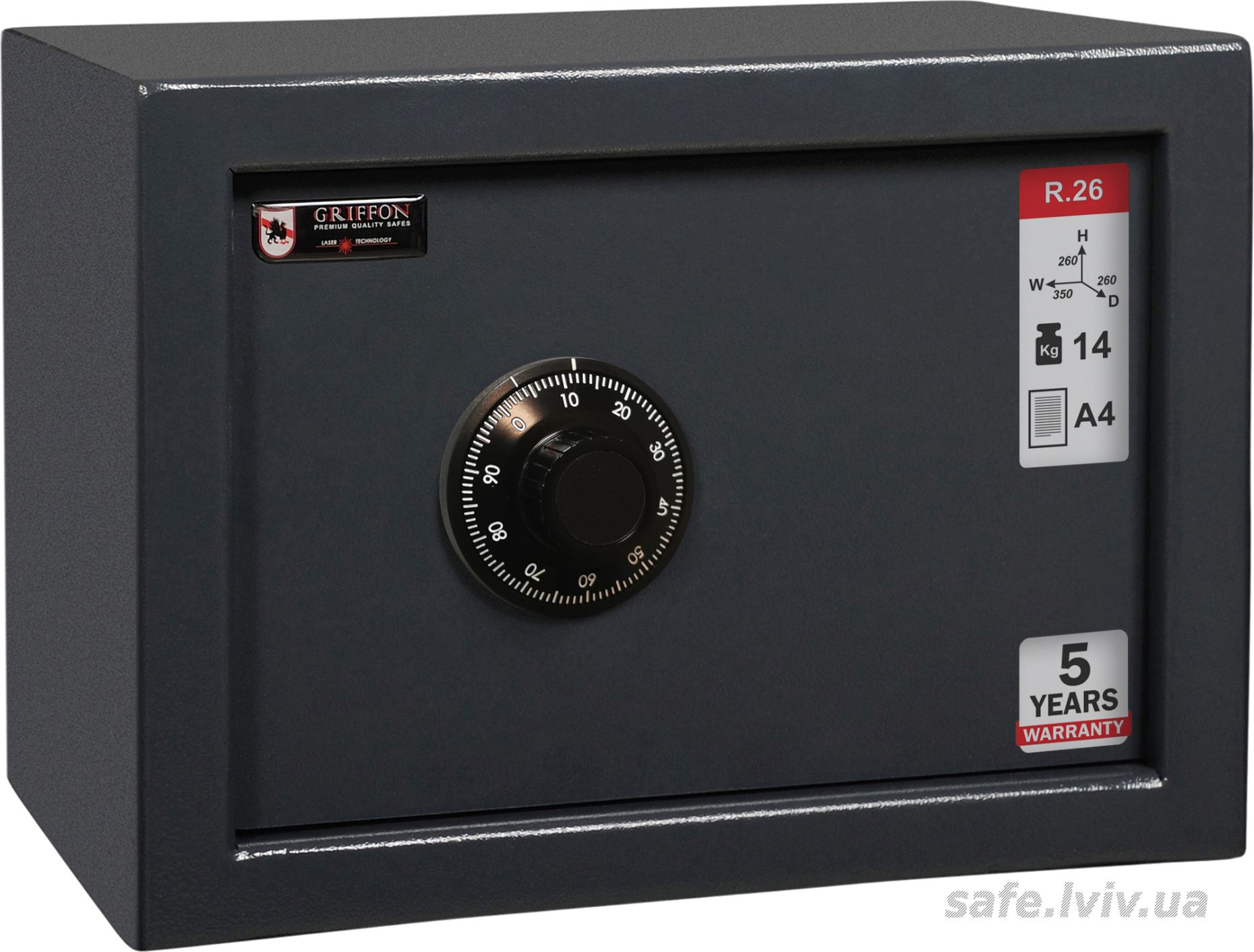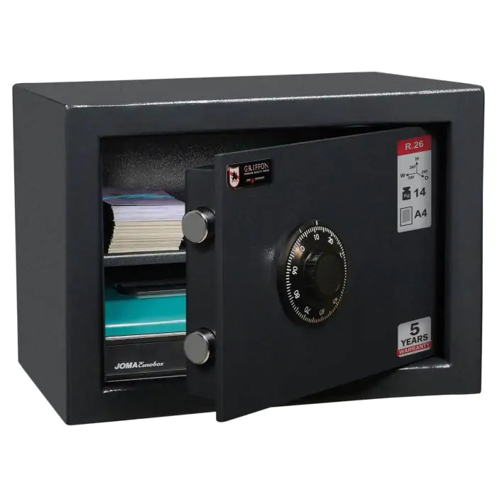 Griffon R.26.C це сейф меблевий, для дому, за допомогою якого можна захистити документи А5 у квартирі, будинку чи офісі. Конструкція корпусу 2 мм (сталь), дверей 5 мм (сталь), ригельна система одностороння, 2 ригелі Ø 25 мм та замок - кодовий механічний La GARD (США) VdS Class 1 (A) забезпечують базовий рівень захисту. Сейф вміщає документи А5. Передбачена можливість анкерування до підлоги чи стіни.