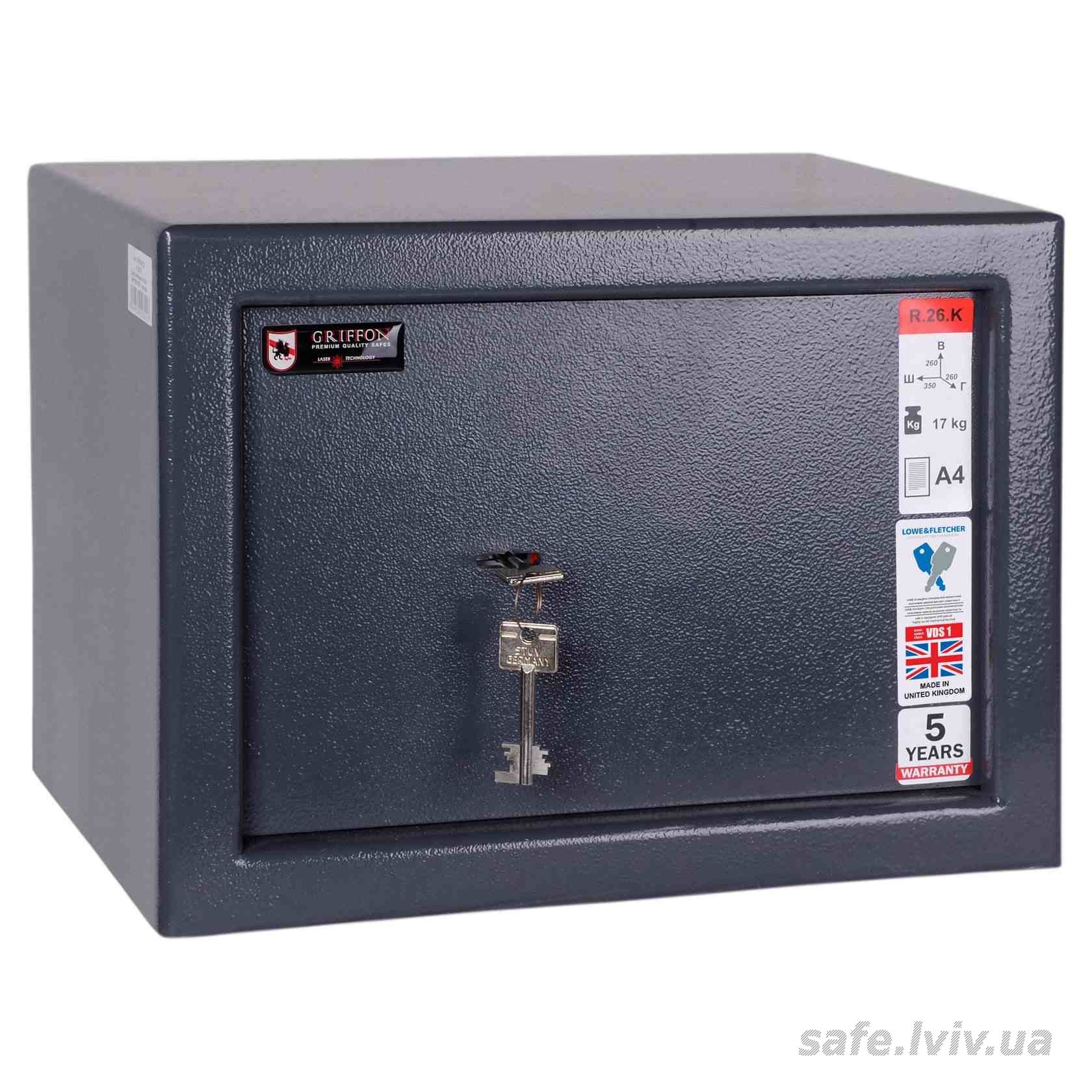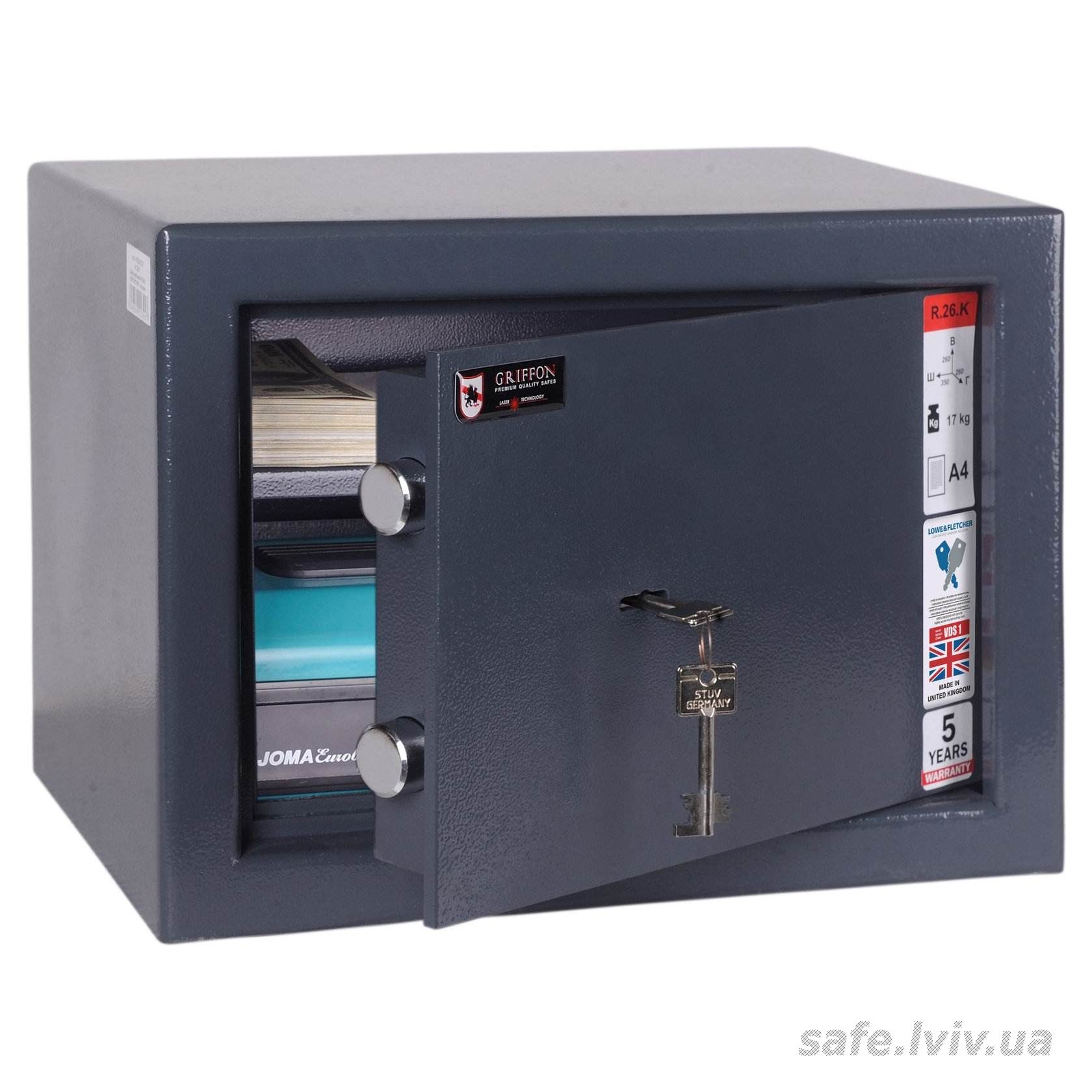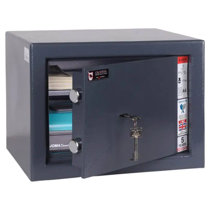 Griffon R.26.K це сейф меблевий, для дому, за допомогою якого можна захистити документи А5 у квартирі, будинку чи офісі. Конструкція корпусу 2 мм (сталь), дверей 5 мм (сталь), ригельна система одностороння, 2 ригелі Ø 25 мм та замок - ключовий STUV (Німеччина) VdS Class 1 (A) забезпечують базовий рівень захисту. Сейф вміщає документи А5. Передбачена можливість анкерування до підлоги чи стіни.